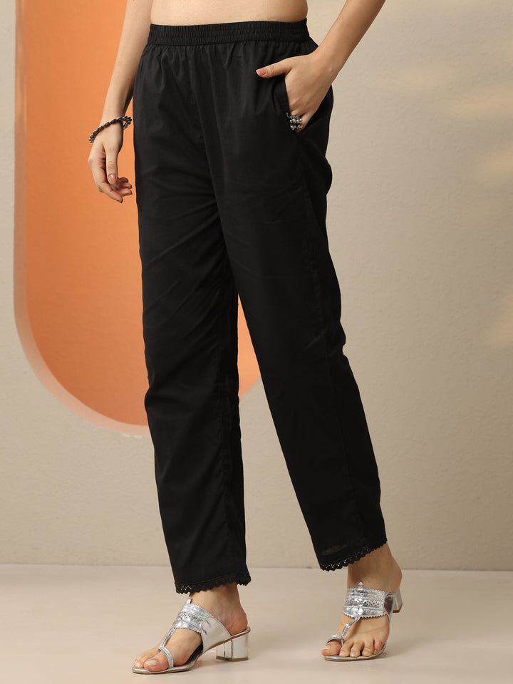 Our 3-piece black cotton straight-fit kurta set features a V-neckline, regular sleeves, and statement yoke. Complemented with straight pants with a partially elasticated waistband and 2 pockets, and a printed dupatta. Adorned with Embroidered, this style is perfect for dark festive occasions.