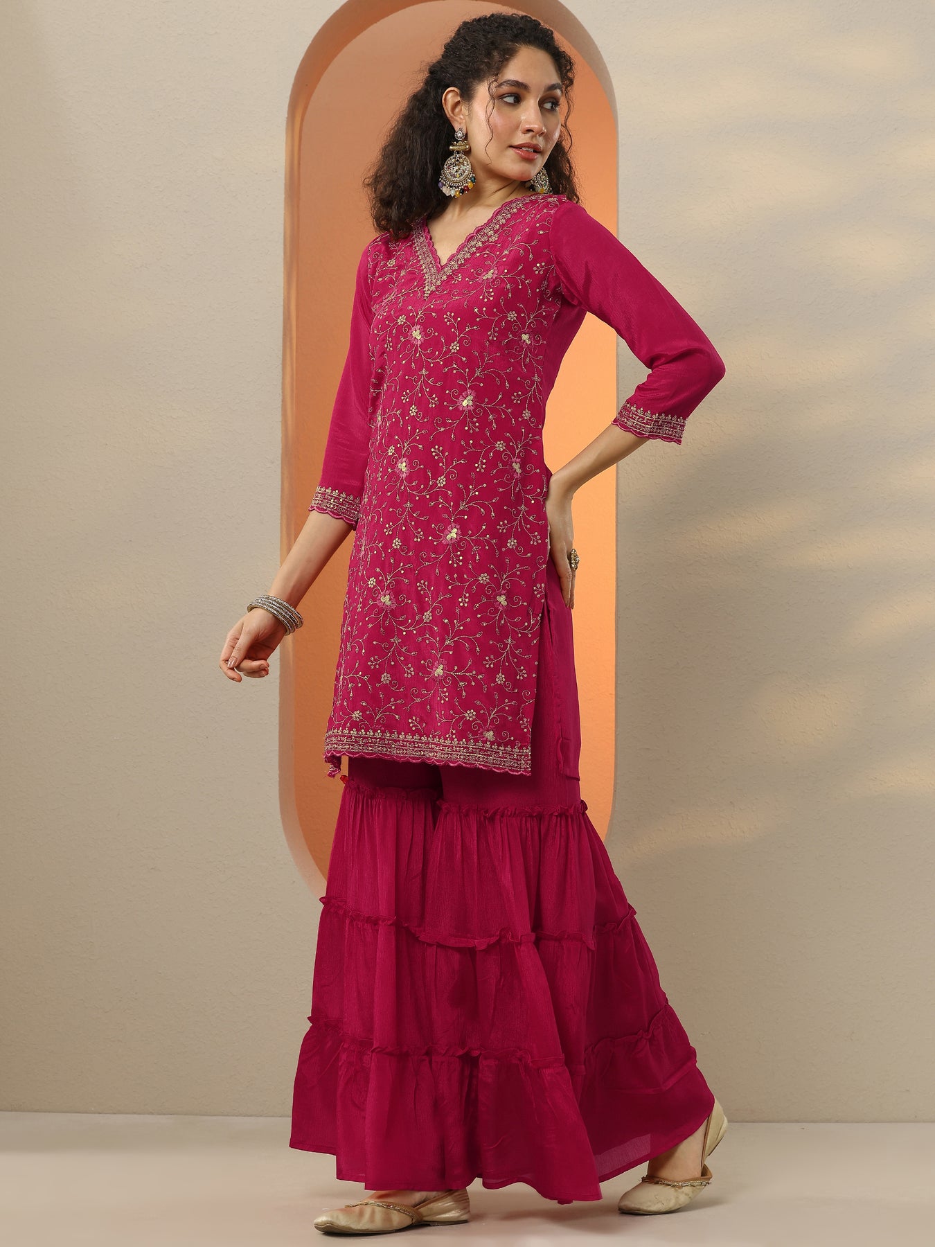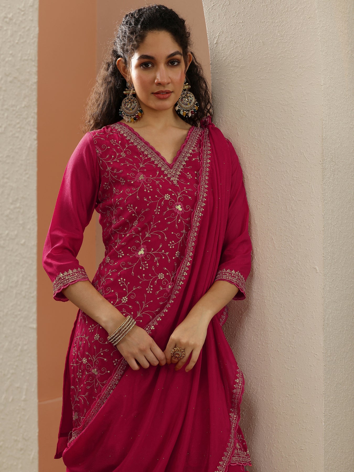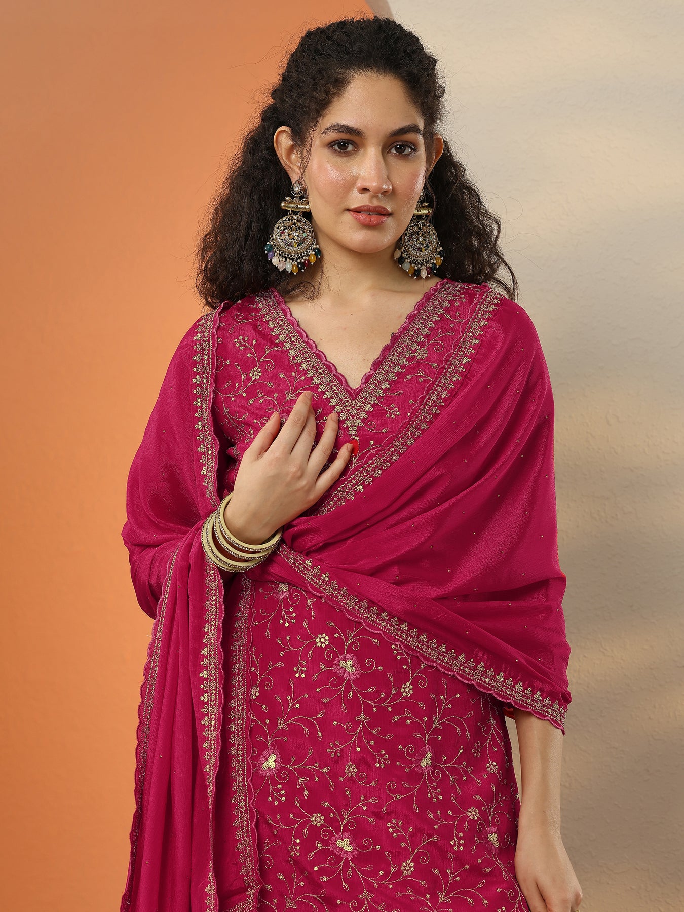 Red Embroidered Chinon Straight Suit Set With Dupatta