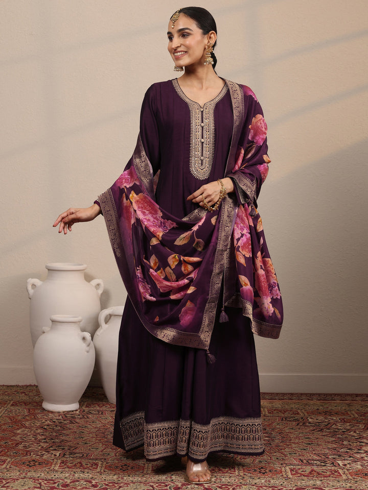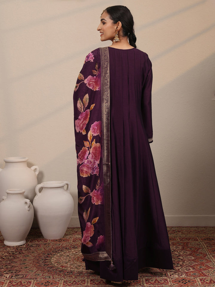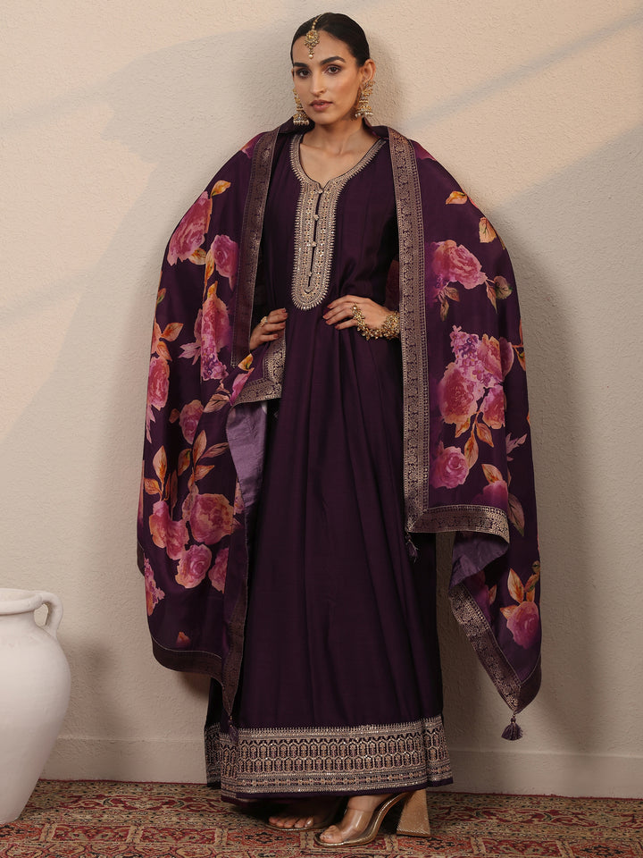 Burgundy Embroidered Silk Blend A-Line Gown With Dupatta