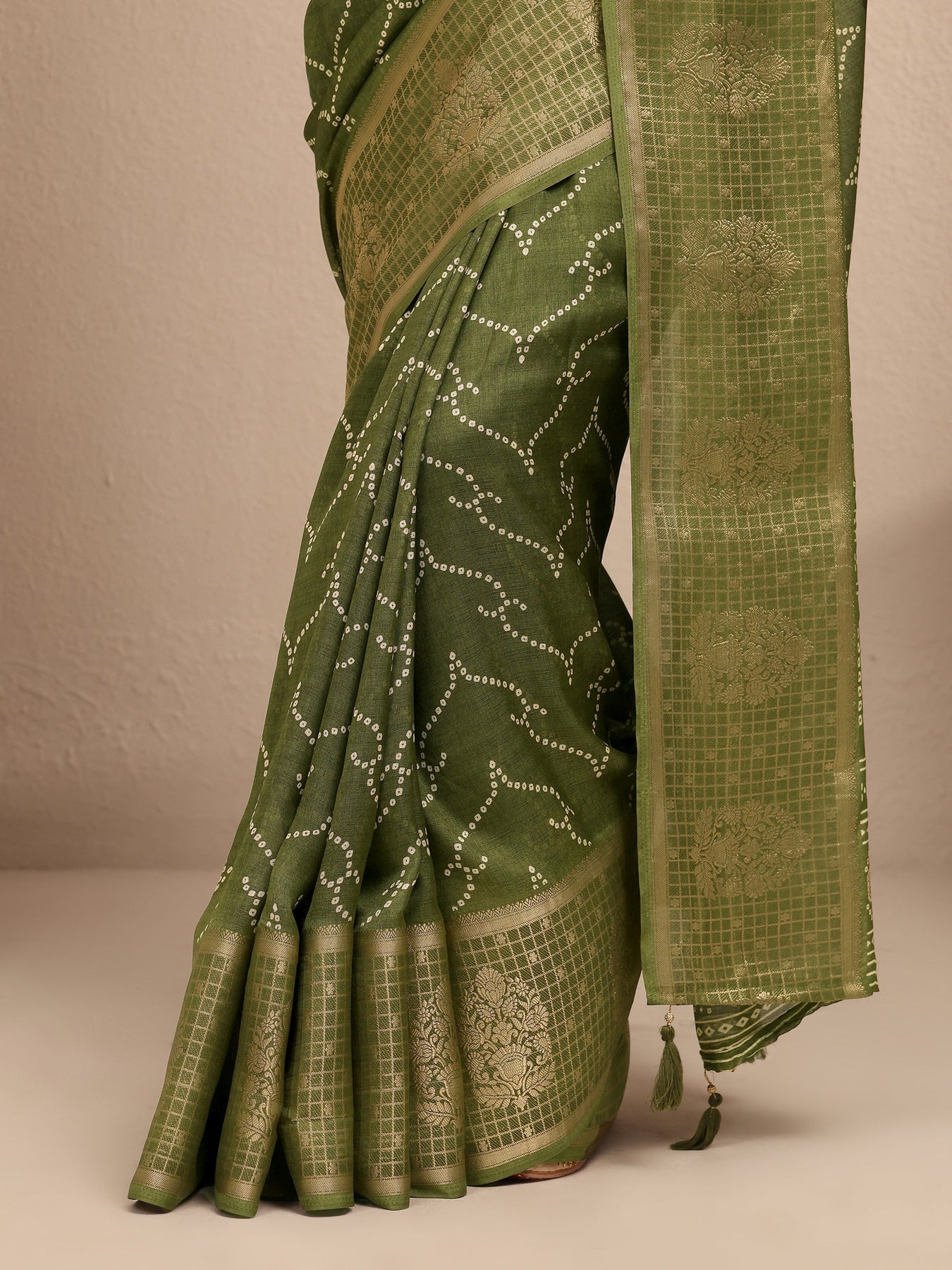 Our olive silk blend saree features captivating bandhani printed. Complemented with an unstitched blouse piece. This charming saree is perfect for festive occasions.