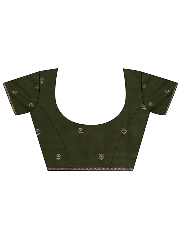 Our olive silk blend saree features captivating embellishments. Complemented with an unstitched blouse piece. This charming saree is perfect for festive occasions.