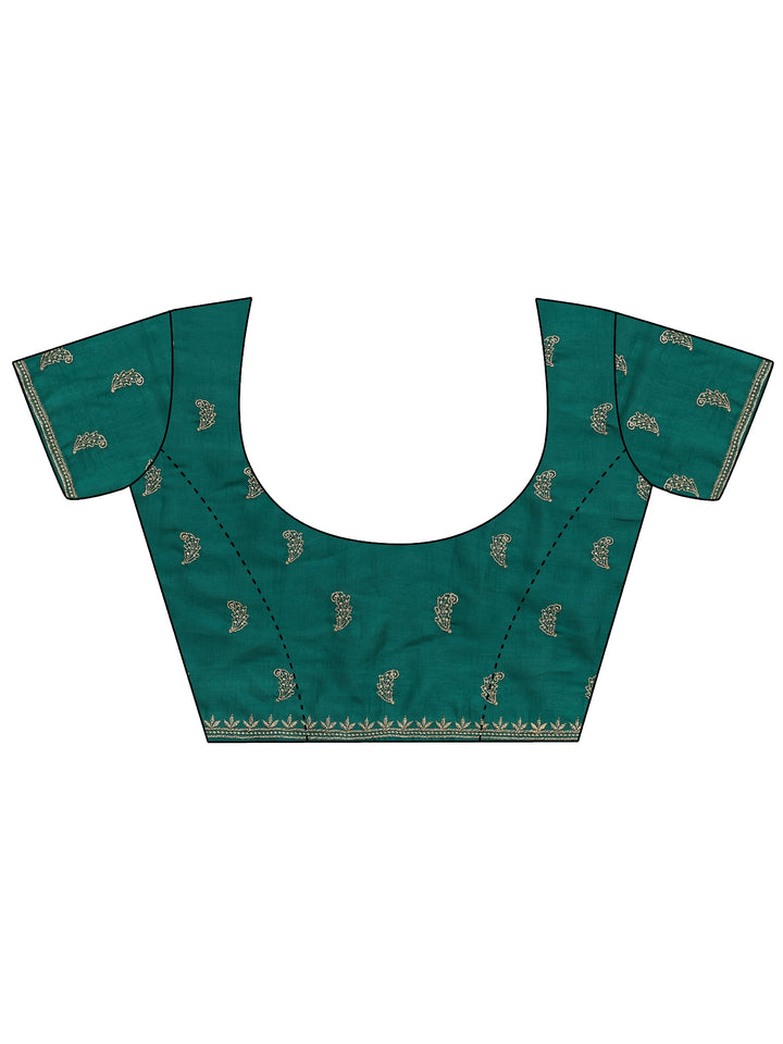 Our teal silk blend saree features captivating embellishments. Complemented with an unstitched blouse piece. This charming saree is perfect for festive occasions.