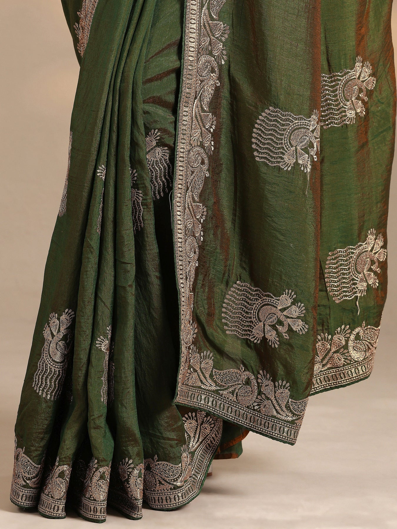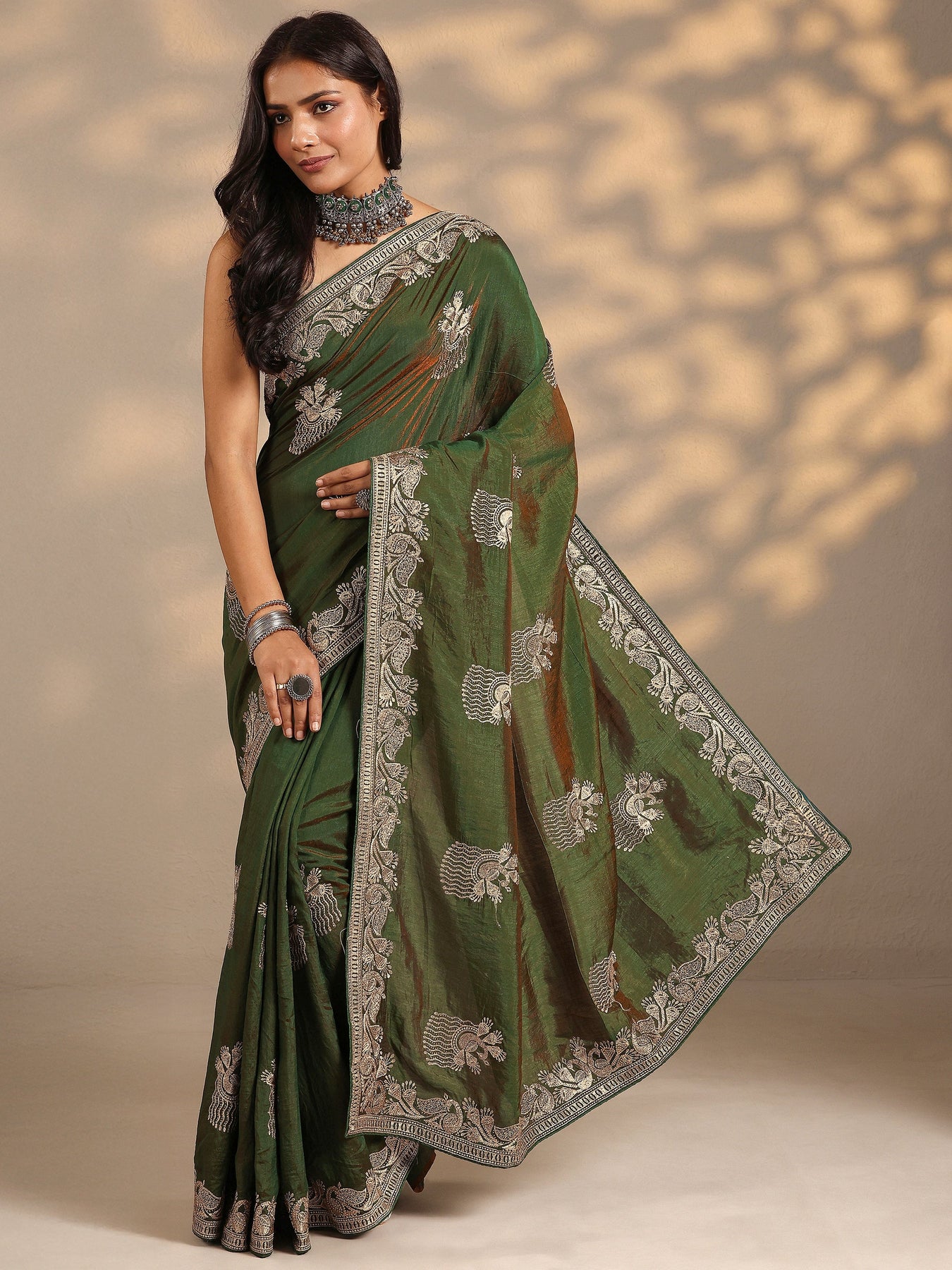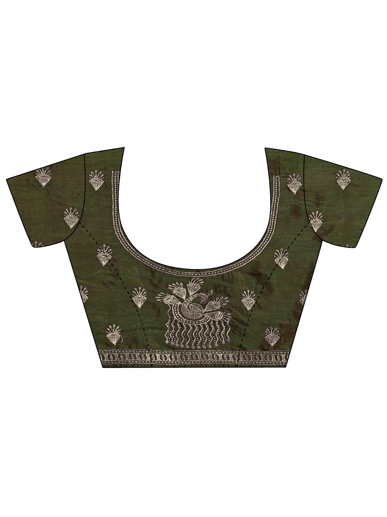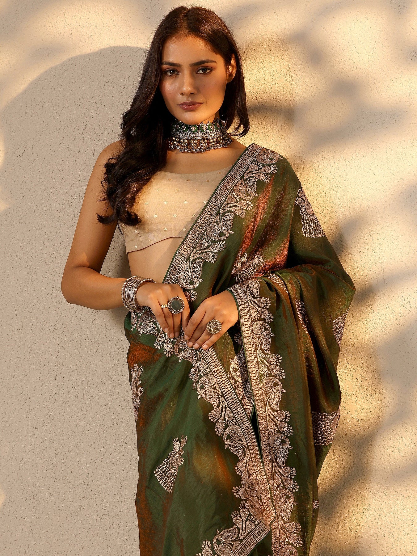 Our Olive Printed Organza Saree Features Captivating Floral Print. Complemented With A Blouse Piece. This Charming Saree Is Perfect For Festive Occasions.