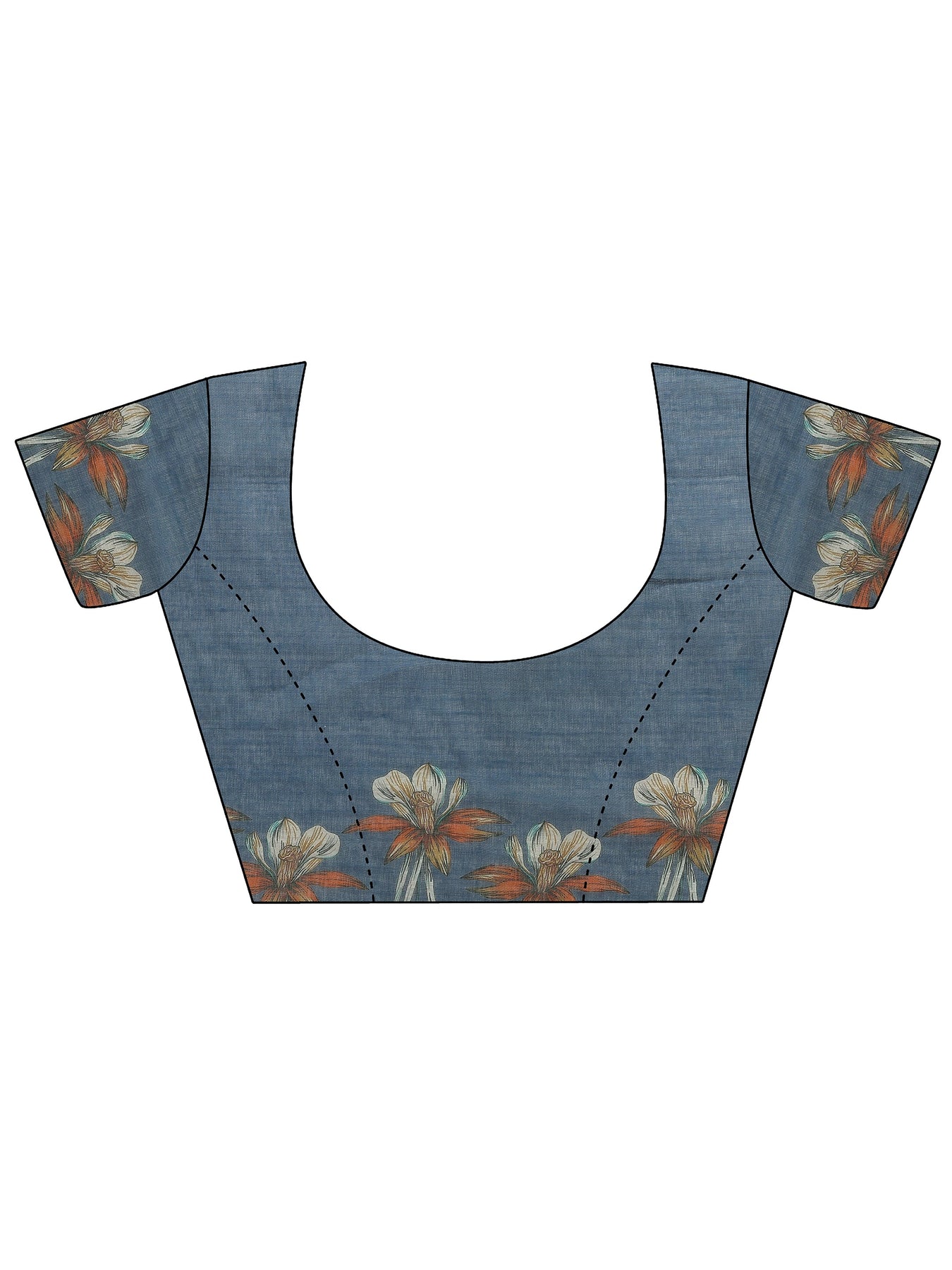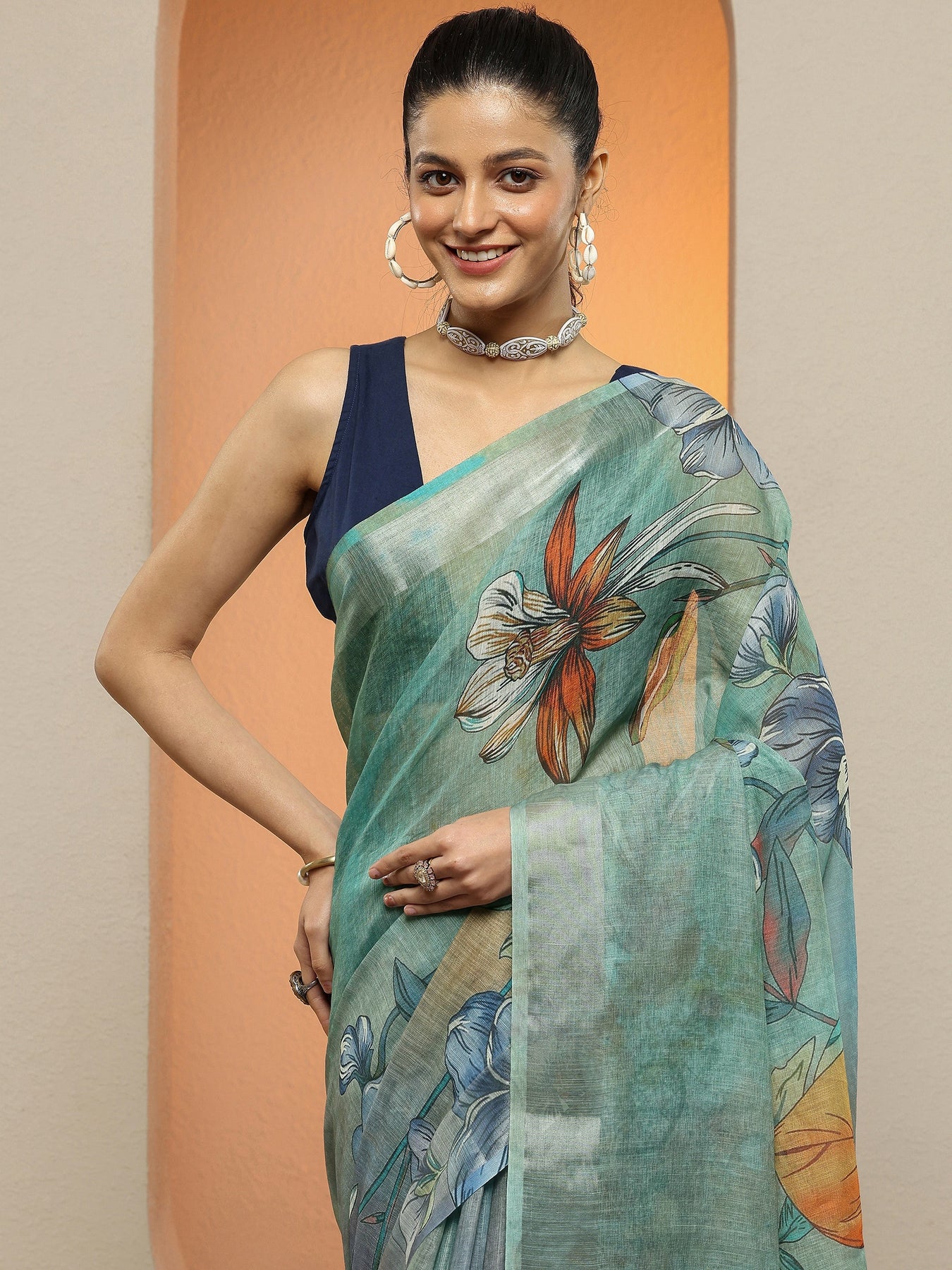 Our Sea Green Printed Linen Saree Features Captivating Floral Print. Complemented With A Stitched Blouse. This Charming Saree Is Perfect For Festive Occasions.