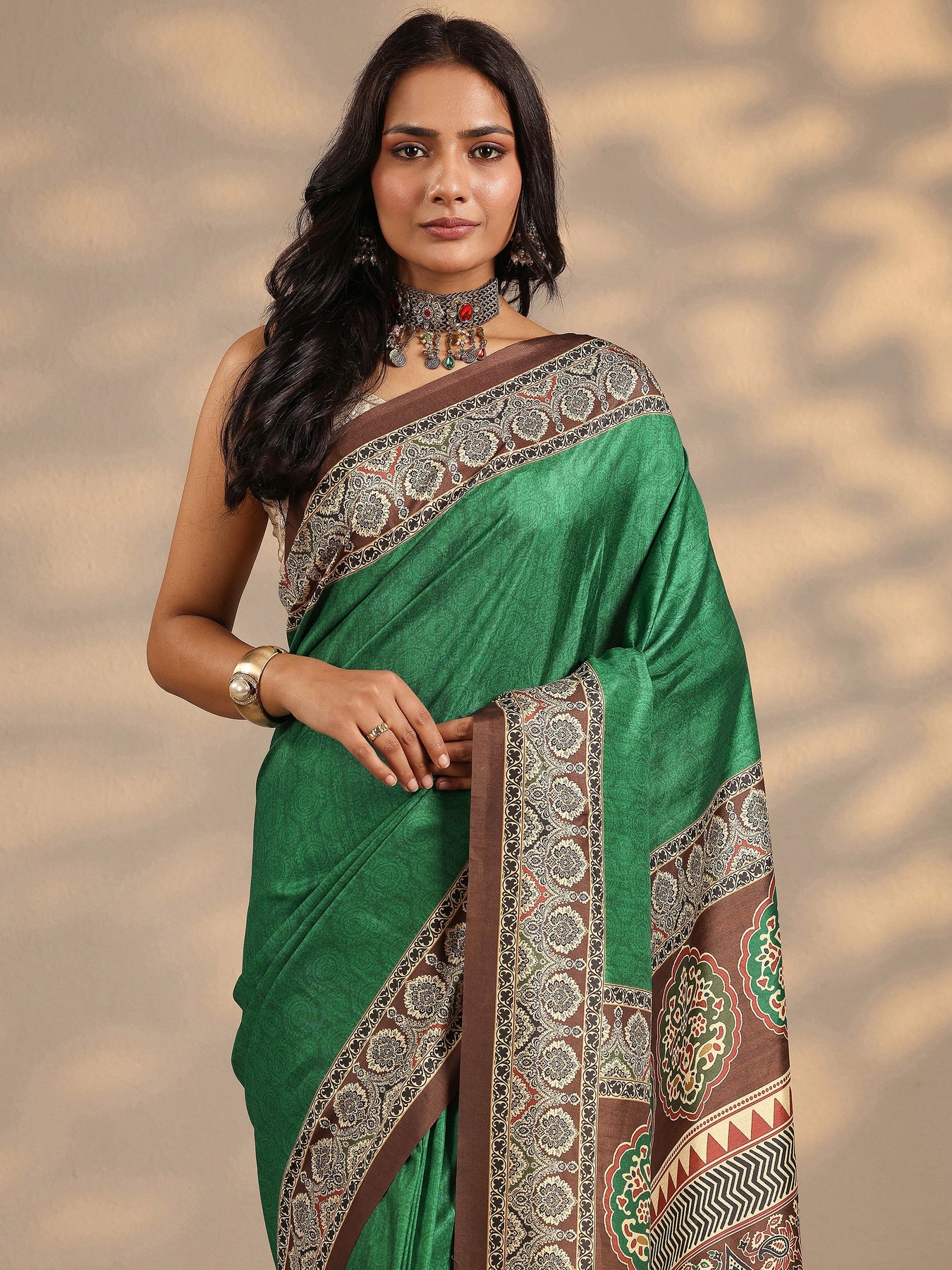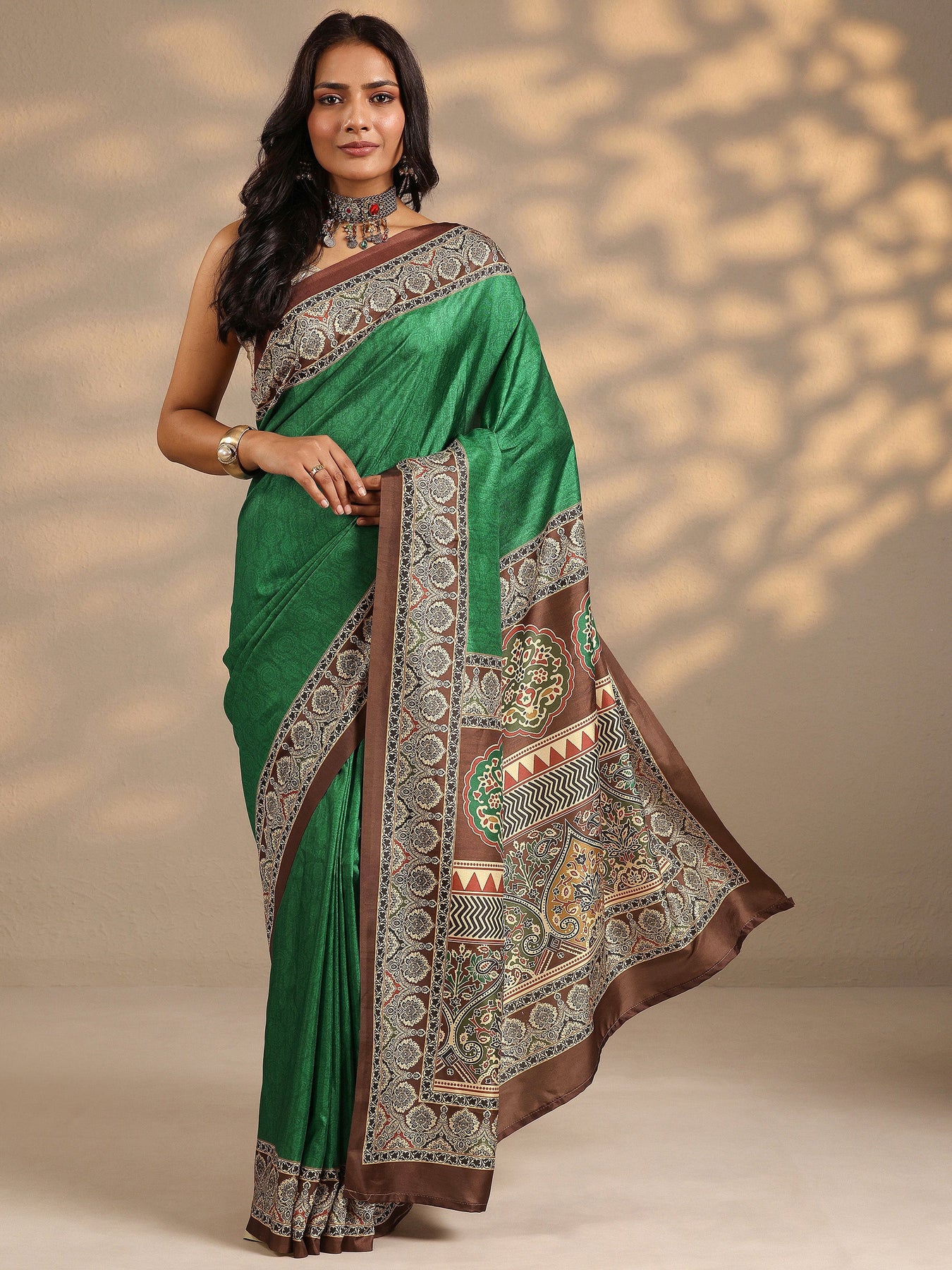 Our Green Printed Silk Blend Saree Features Captivating Traditional Motifs Print. Complemented With A Blouse Piece. This Charming Saree Is Perfect For Festive Occasions.