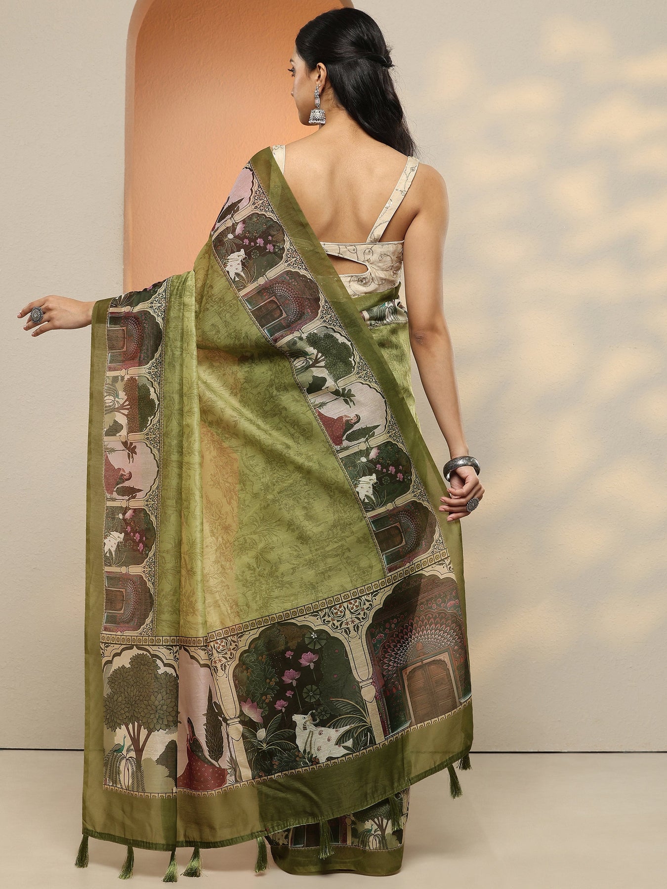 Our Olive Printed Silk Blend Saree Features Captivating Top Print. Complemented With A Blouse Piece. This Charming Saree Is Perfect For Occasion.