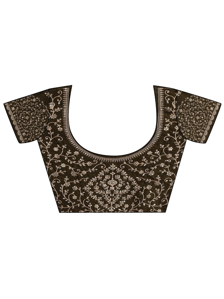 Our olive printed organza saree features captivating embellishments. Complemented with a stitched blouse. This charming saree is perfect for festive occasions.