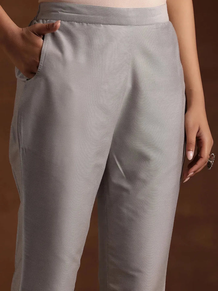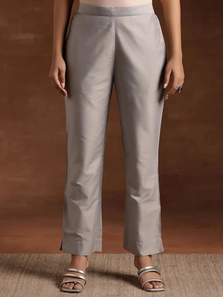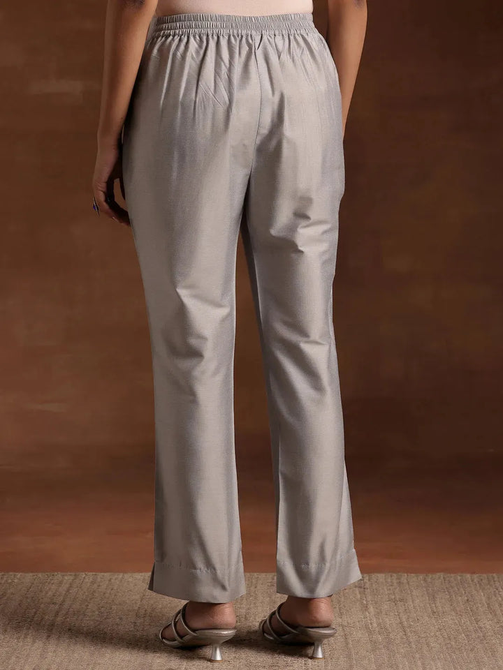 Our grey solid silk trousers feature a partially elasticated waistband and roomy pockets. Crafted with attention to detail, this elegant style is perfect for work and beyond.