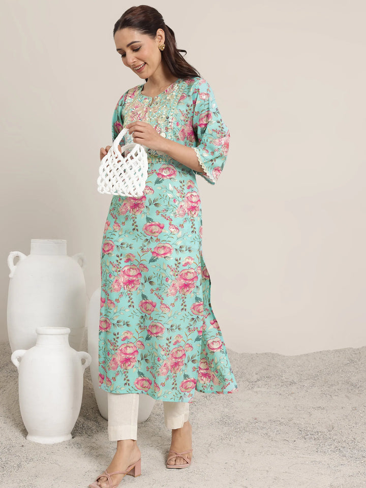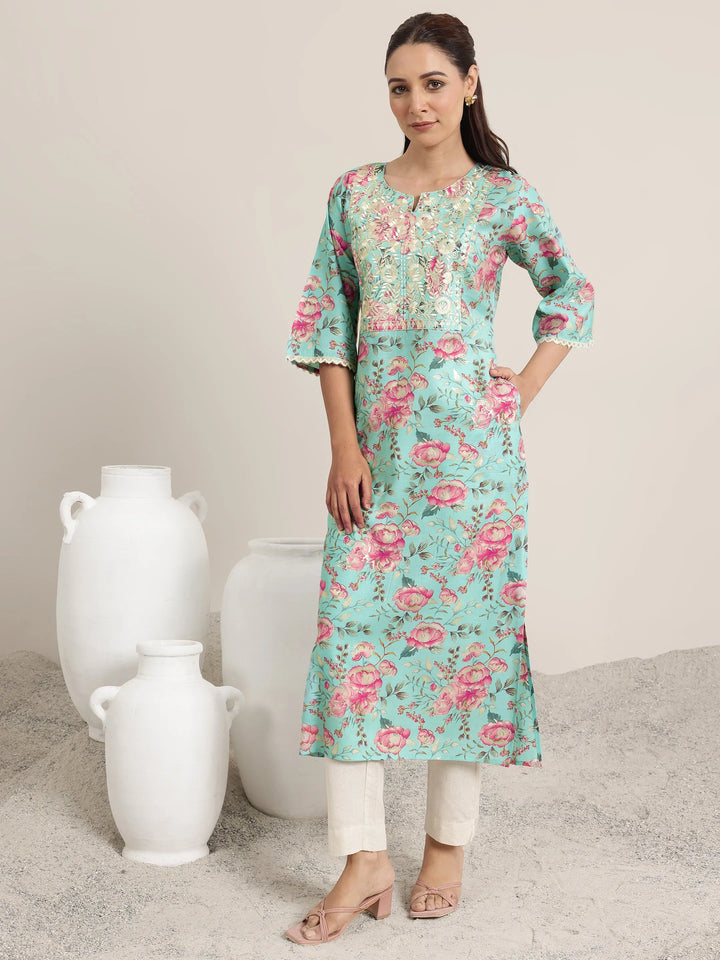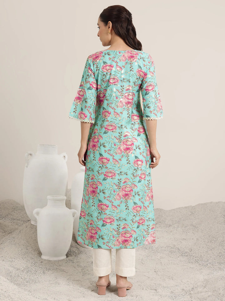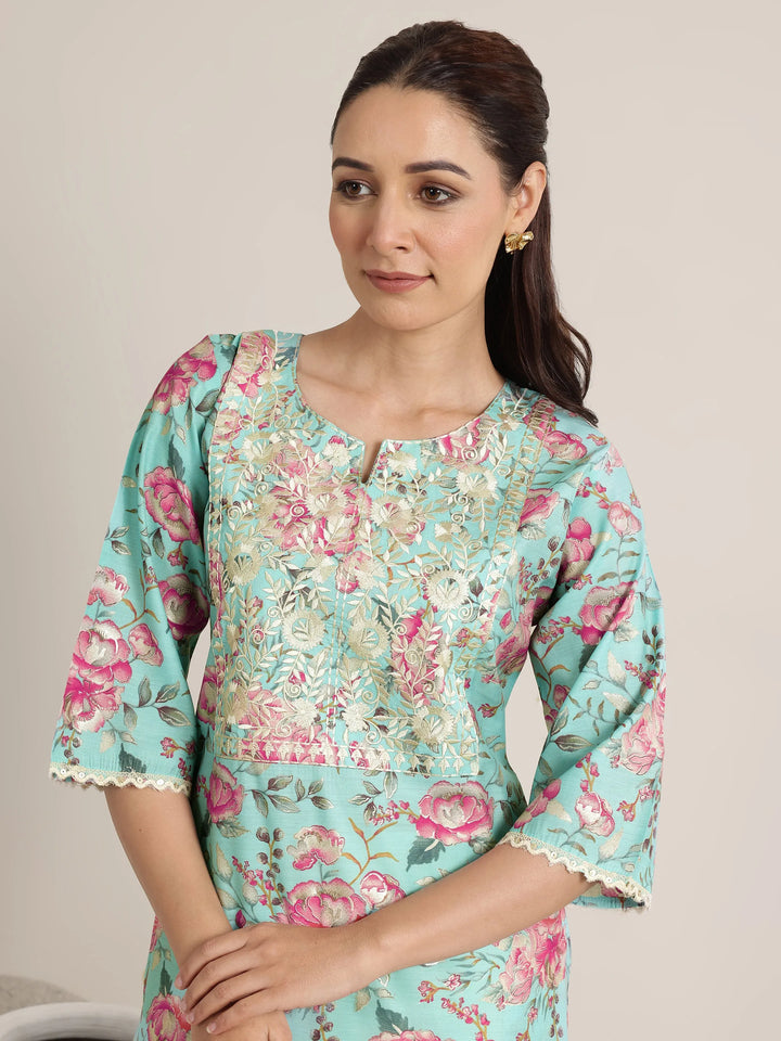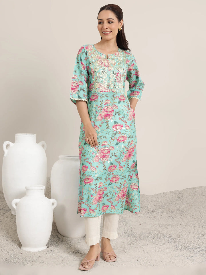 Our 3-piece blue yoke design silk kurta features a notched neckline, three-quarter flared sleeves, and a statement yoke. Highlighted with intricate thread work and lace detailing, this style is perfect for casual outings.