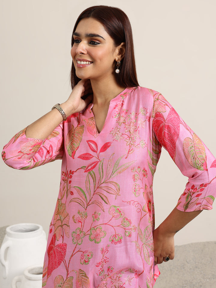 Our pink printed muslin kurti features a V-neck neckline and three-quarter sleeves. Highlighted with captivating printed embellishments, this style is perfect for festive occasions.