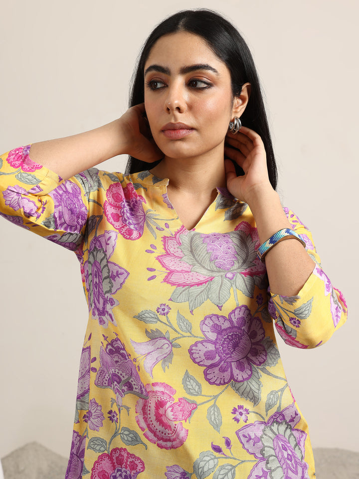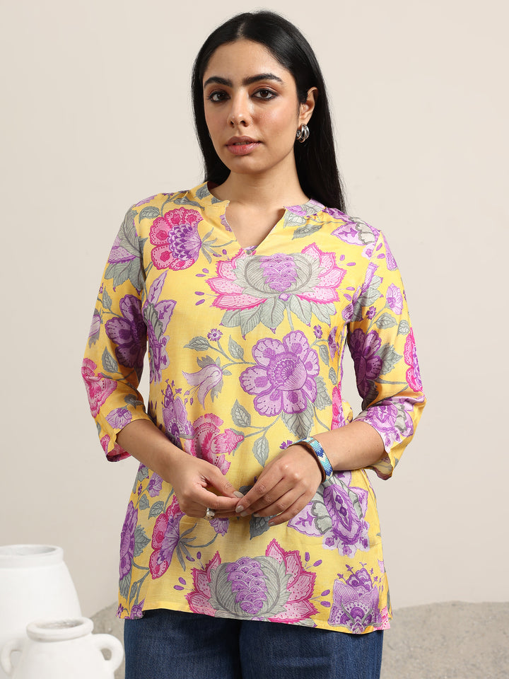 Our yellow and purple printed muslin kurti features a V-neck neckline and three-quarter sleeves. Highlighted with captivating printed embellishments, this style is perfect for festive occasions.
