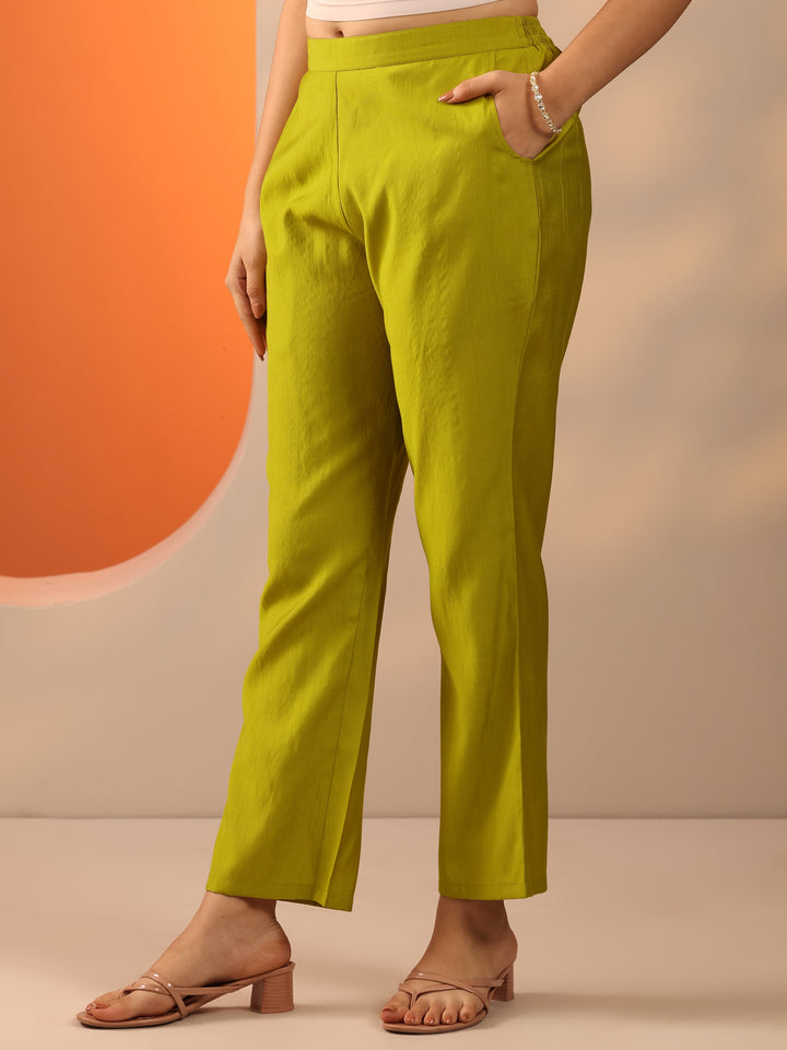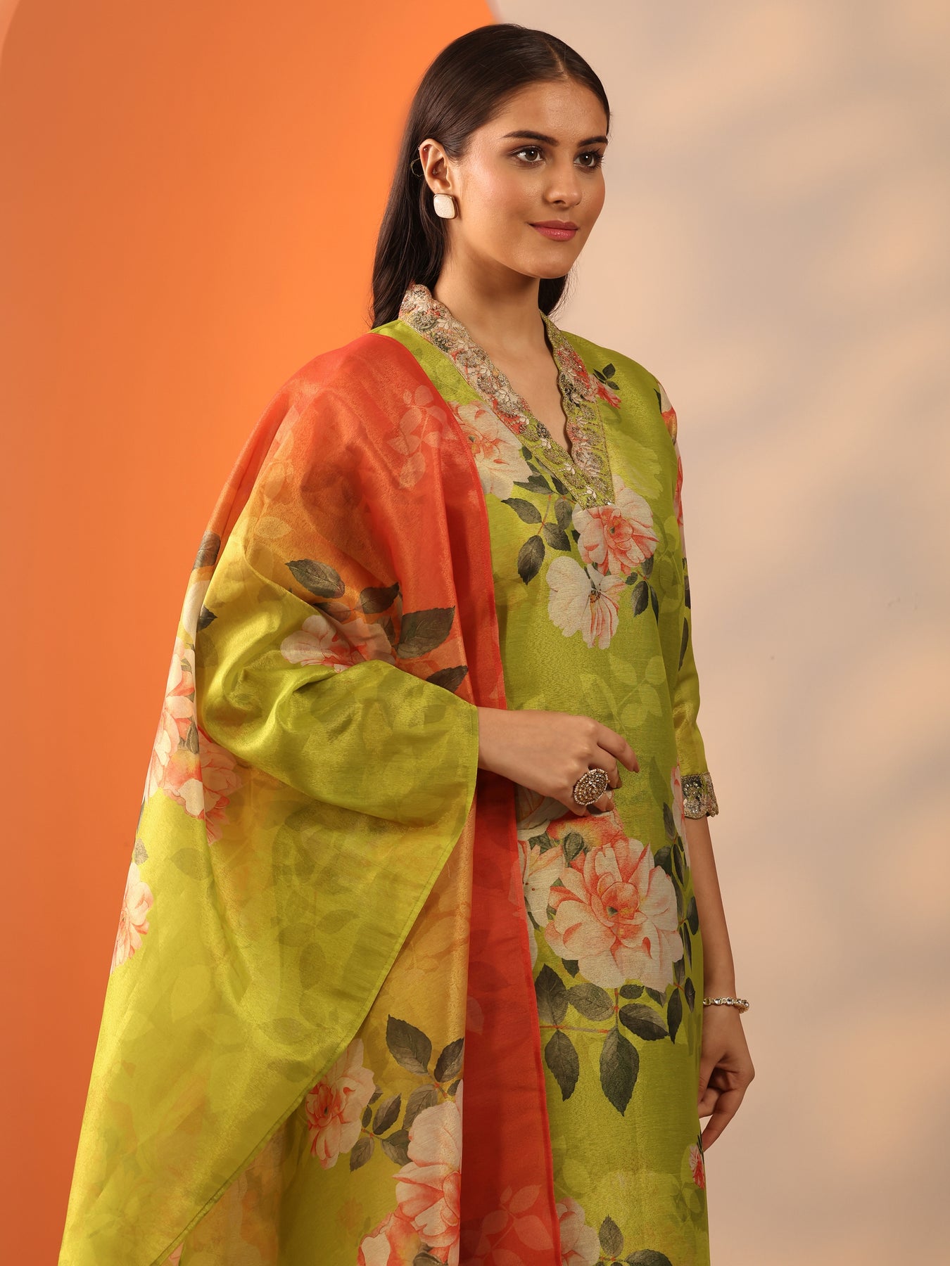 Our 3-piece Green Silk blend Straight-Fit Kurta Set features a V-Neckline, Regular Sleeves, and statement yoke. Complemented with Straight Pants with a Partially Elasticated waistband and 2 pockets, and a Floral dupatta. Adorned with Floral prints, this style is perfect for Festive occasions.
