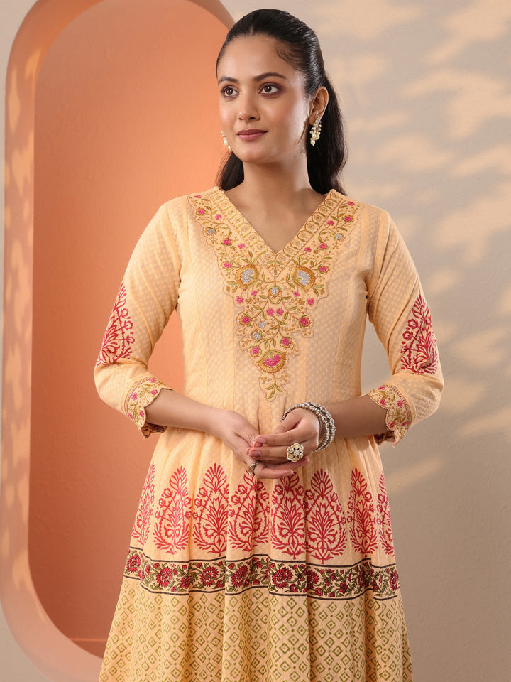 Peach Printed Cotton Anarkali Suit Set With Dupatta