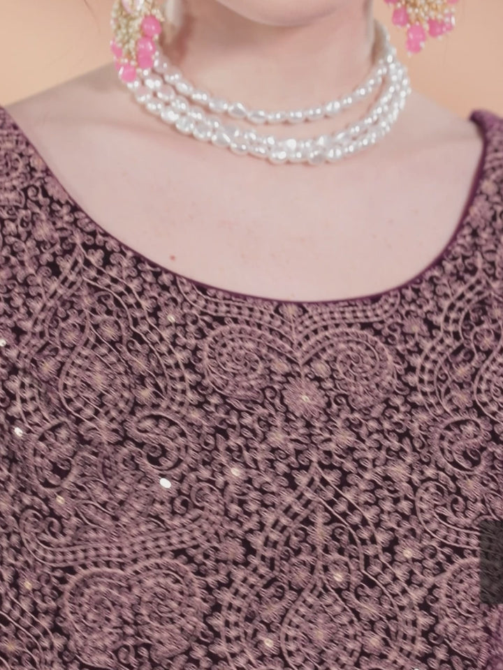 Our 4-piece burgundy velvet Lehenga set features a sleeveless embellished crop top with a round neckline. Complemented with a flared skirt with a partially elasticated waistband, a net dupatta, and an embellished belt. Adorned with intricate embroidery, sequins accents, and Gota Patti detailing, this style is perfect for festive celebrations.