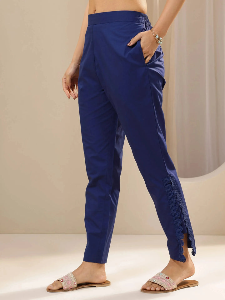Our blue cotton trousers feature a slip-on closure and 2 pockets. Adorned with self design, this intricate style is perfect for casual wear.