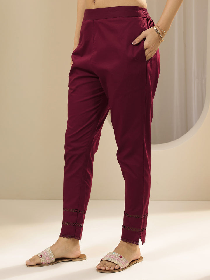 Our burgundy cotton trousers feature a slip-on closure and 2 pockets. Adorned with solid embellishments, this intricate style is perfect for casual wear.
