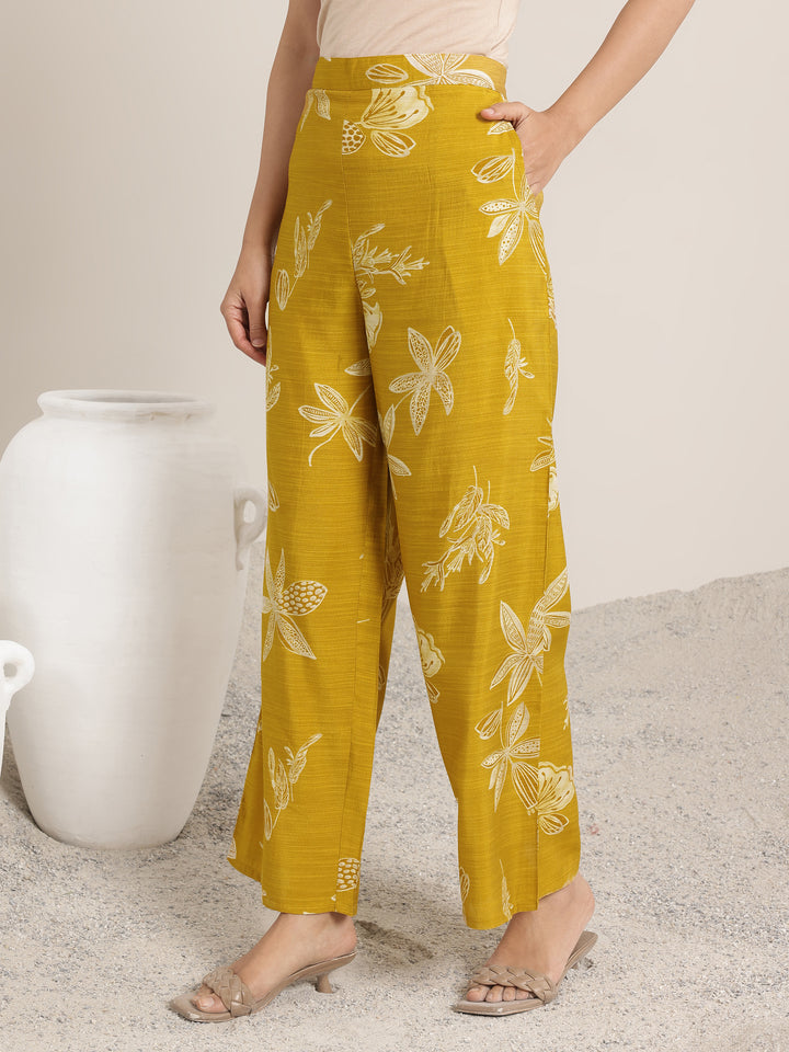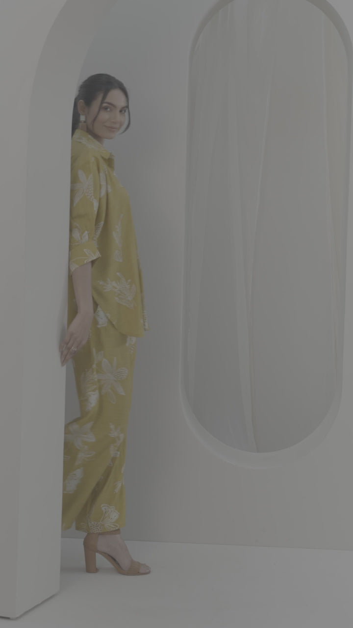 Our 2-piece mustard yellow silk blend co-ord set features a buttoned-down kurta with a shirt-collar and three-quarter sleeves secured with button closure. Complemented with matching palazzo pants with a partially elasticated waistband and roomy pockets. Highlighted with stylish buttons and floral prints, this style is perfect for casual outings.