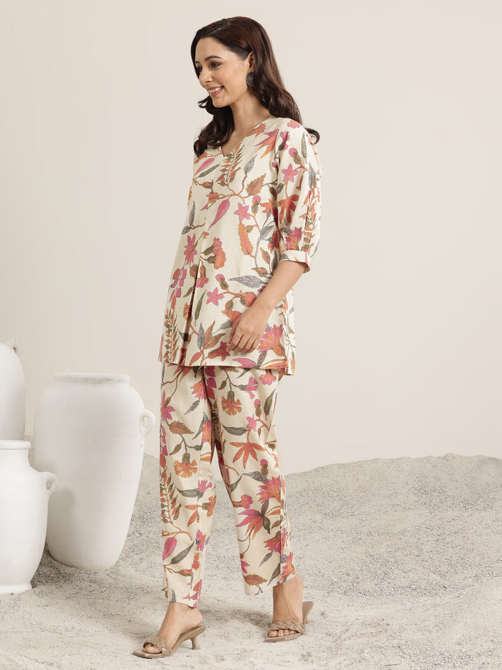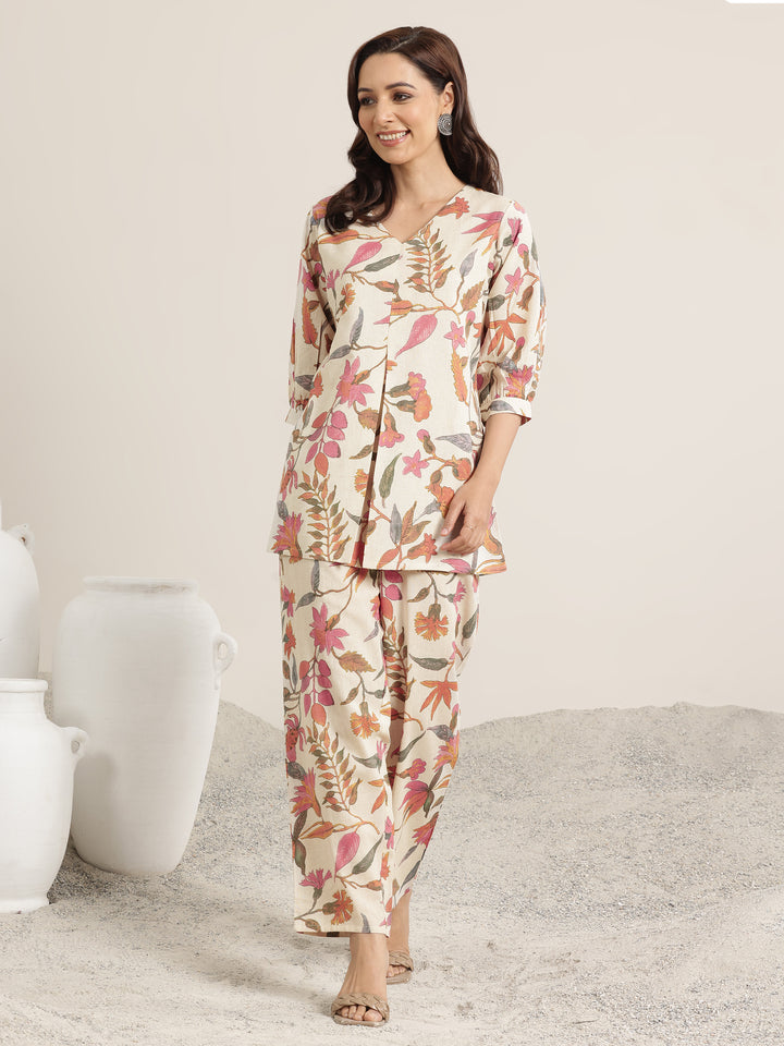 Our 2-piece off white printed cotton co-ord set features a kurta with a V-neckline and three-quarter bishop sleeves. Complemented with matching trousers with a partially elasticated waistband and roomy pockets. Highlighted with floral prints, this style is perfect for casual outings.