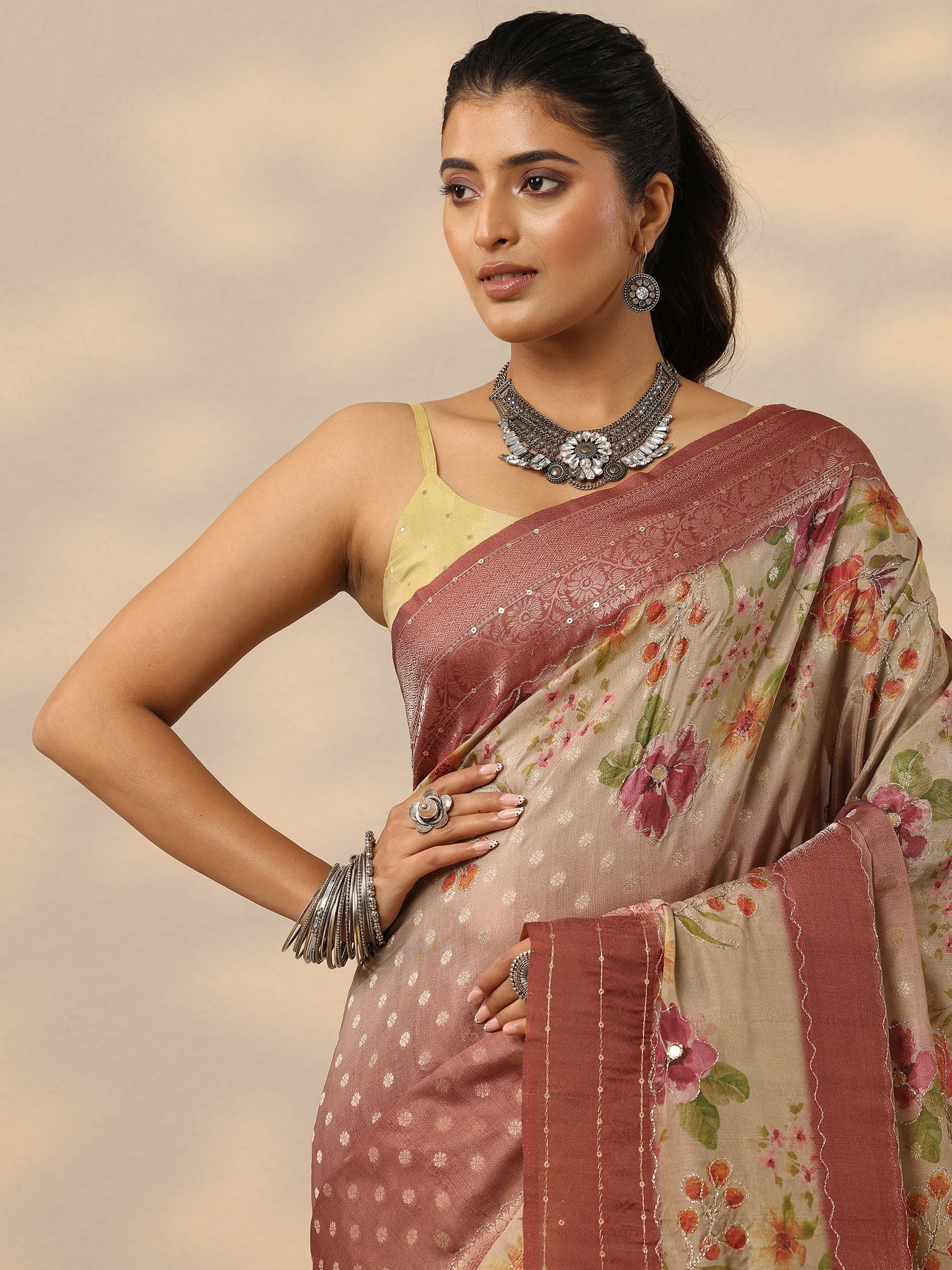 Our brown printed silk blend saree features captivating floral print. Complemented with a blouse piece. This charming saree is perfect for festive occasions.