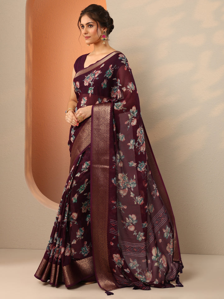 Burgundy Printed Georgette Saree With Unstitched Blouse Piece