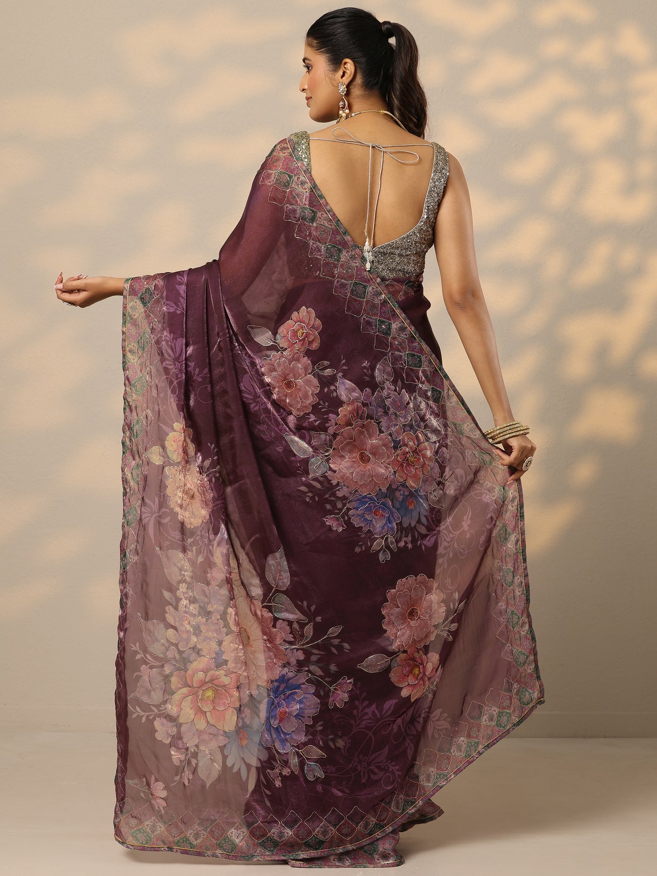 Our purple printed organza saree features captivating floral print. Complemented with a stitched blouse. This charming saree is perfect for festive occasions.
