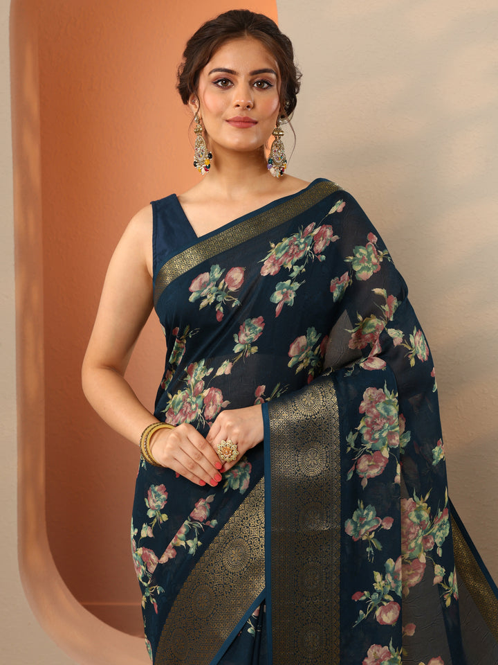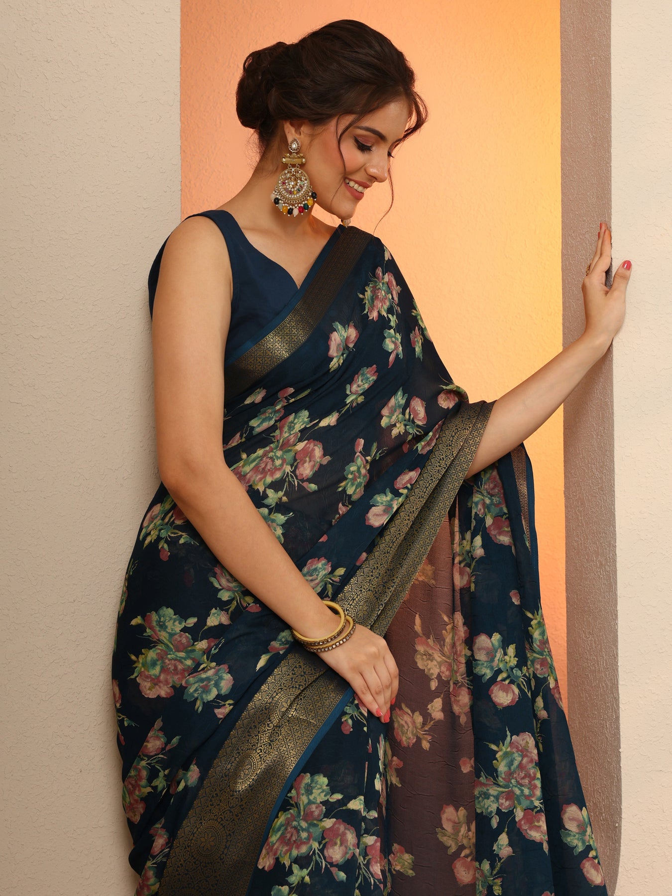 Our Navy Blue Printed Georgette Saree Features Captivating Floral Print. Complemented With An Unstitched Blouse Piece. This Charming Saree Is Perfect For Dark Festive Wear
