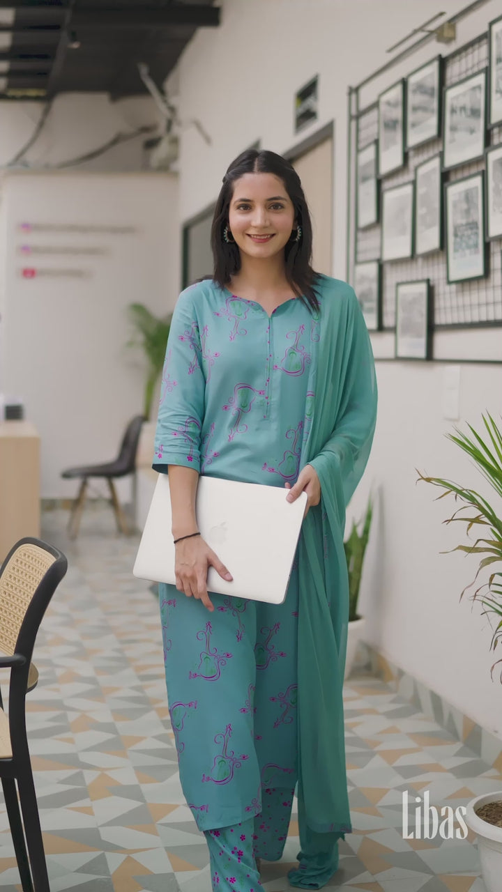 Blue Printed Rayon Straight Kurta With Palazzos & Dupatta - Libas