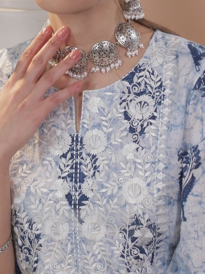 Our 3-piece white cotton suit set highlighted with a paisley floral print features a straight-fit kurta with a notched neckline, straight pants with a partially elasticated waistband and roomy pockets, and a dupatta in a chevron print. This style is perfect for work and beyond.