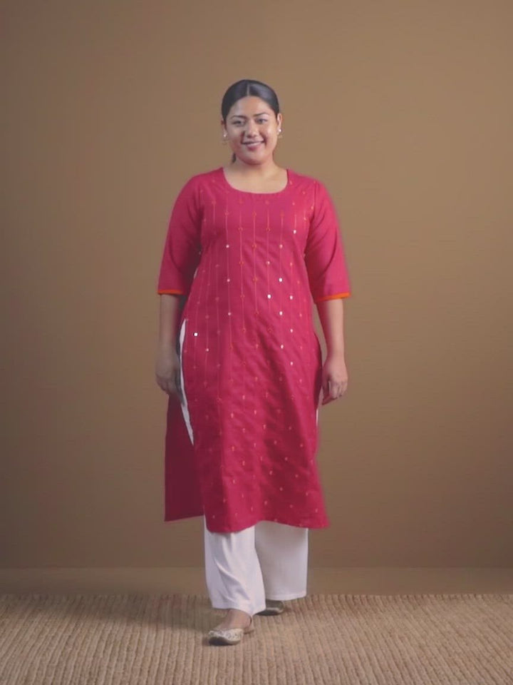 This pink round neck kurta is crafted in a straight cut with side slits. Crafted in cotton, featuring mirror work details and contrasting trims. Perfect for festive occasions.