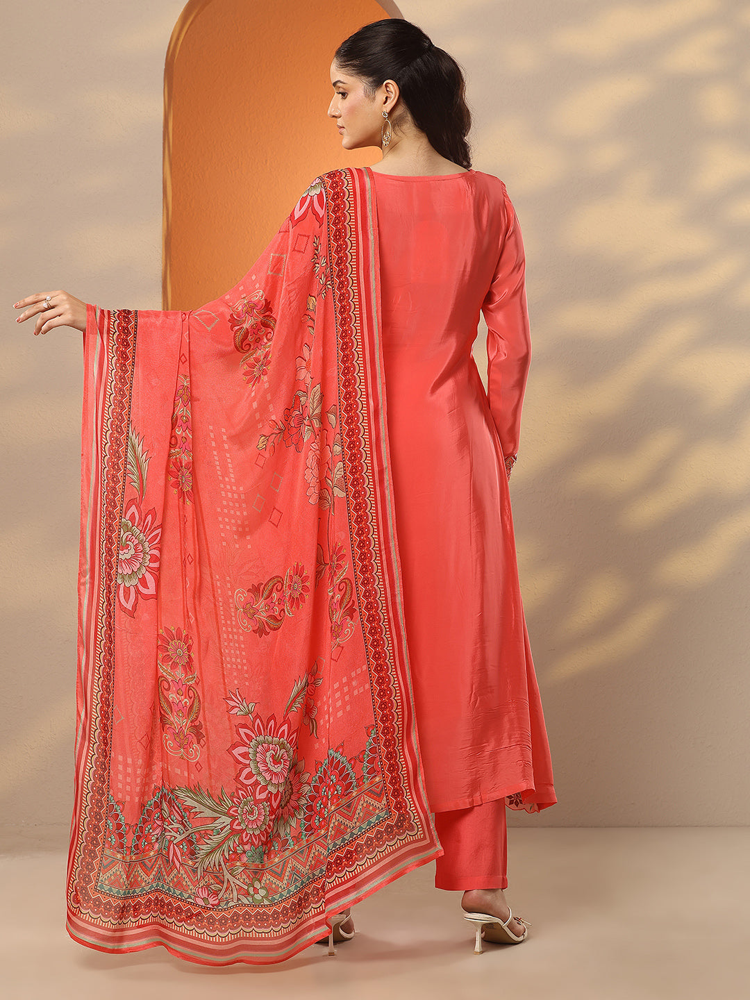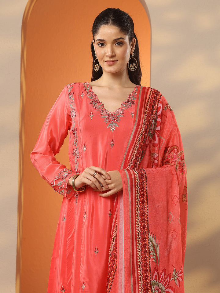 Coral Embroidered Crepe A-Line Suit Set With Dupatta