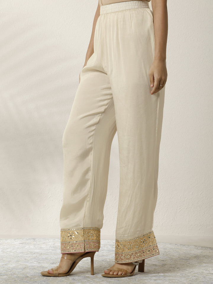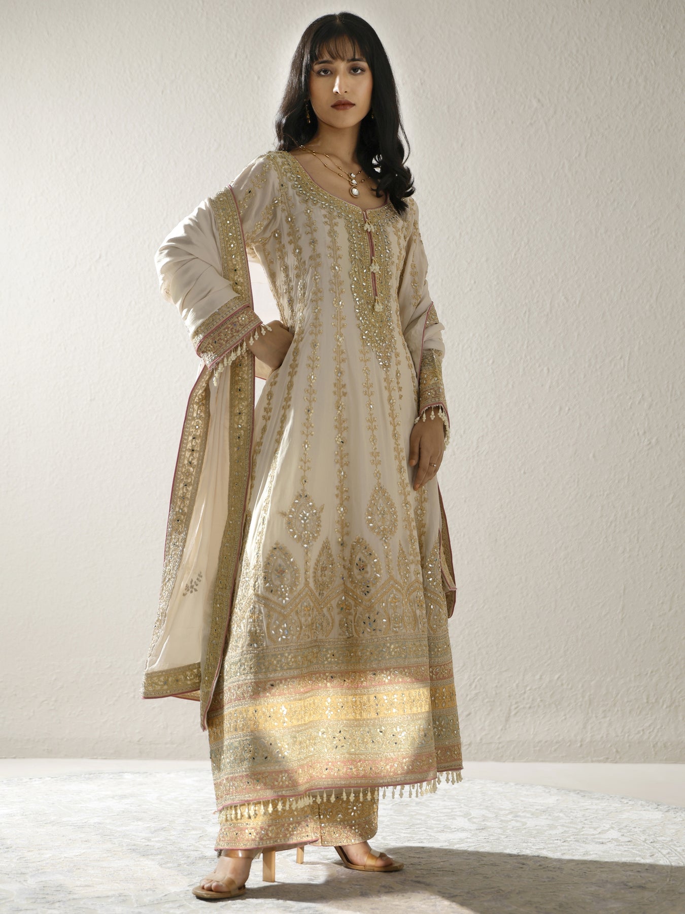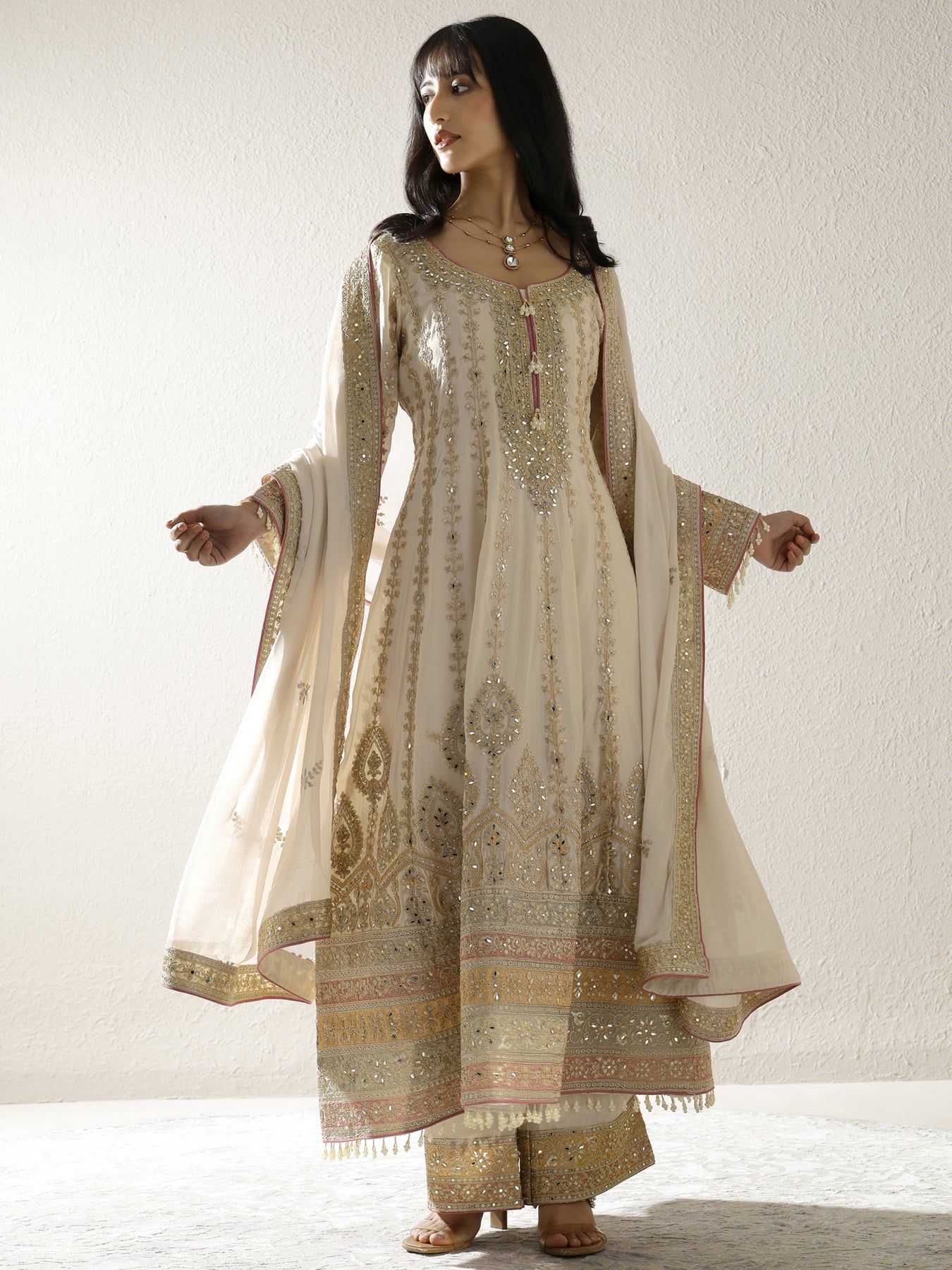 Our 3-piece Beige Chinon Anarkali Kurta Set features a Round Neckline, Regular Sleeves, and statement Yoke. Complemented with Lining and Straight Pants with a Partially Elasticated waistband and 2 pockets, and an Embroidered Dupatta. Adorned with zari embroidered, this style is perfect for Festive occasions.