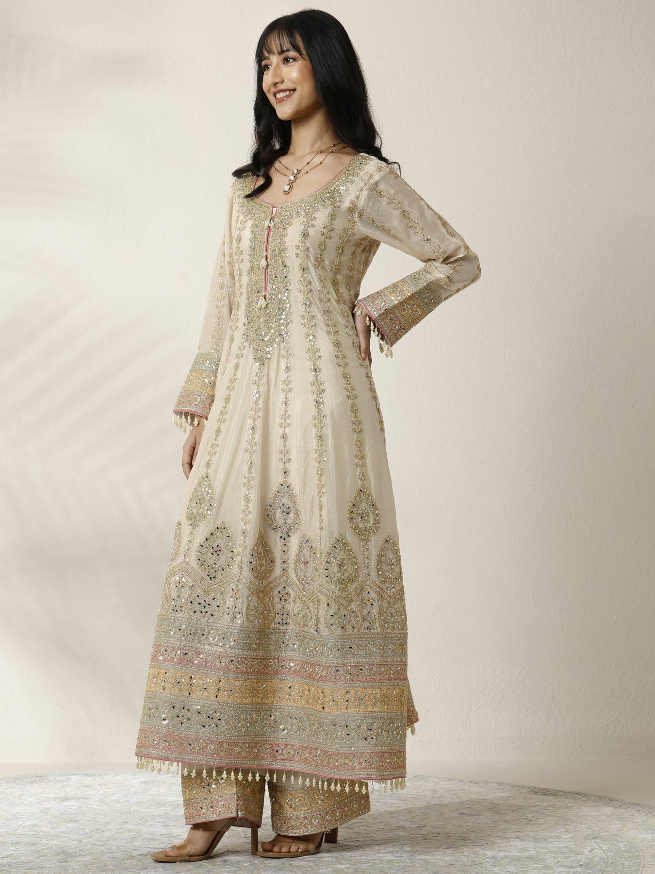 Pair this Anarkali embroidered kurta with gold jewellery, a clutch bag, and embellished juttis to achieve an elegant and refined look suitable for festive occasions.