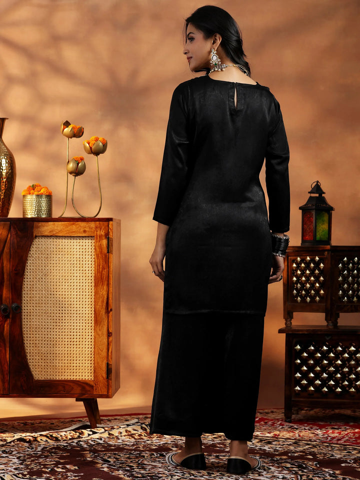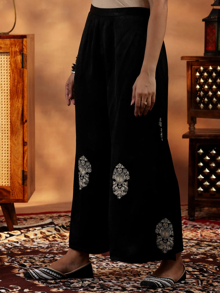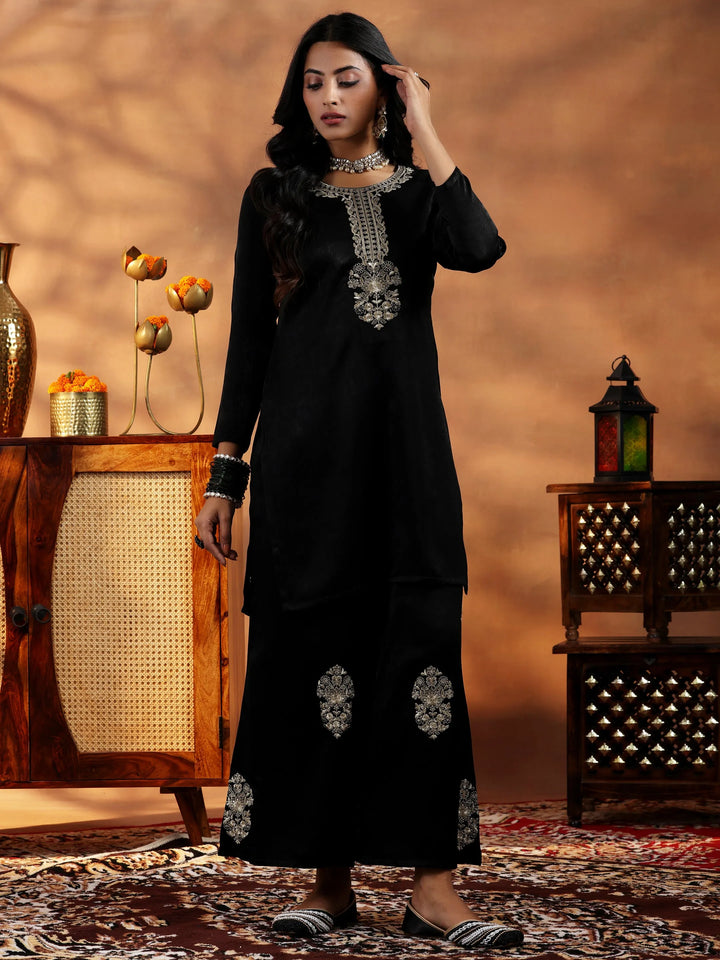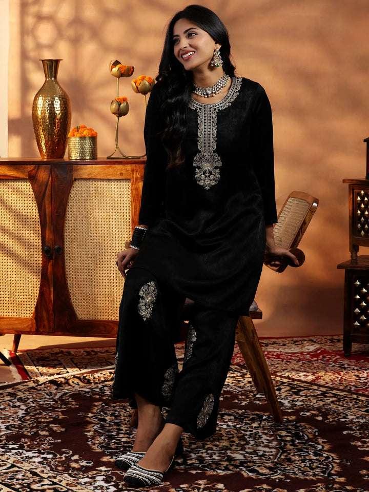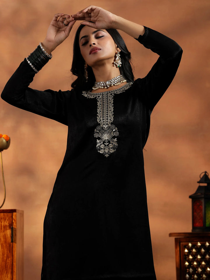 Our 2-piece black embroidered Velvet co-ord set features a straight-fit tunic with a round neckline, three-quarter sleeves, and a statement yoke. Complemented with matching embroidered trousers with a partially elasticated waistband and roomy pockets. Adorned with intricate thread work and sequins, this style is perfect for light festivities.