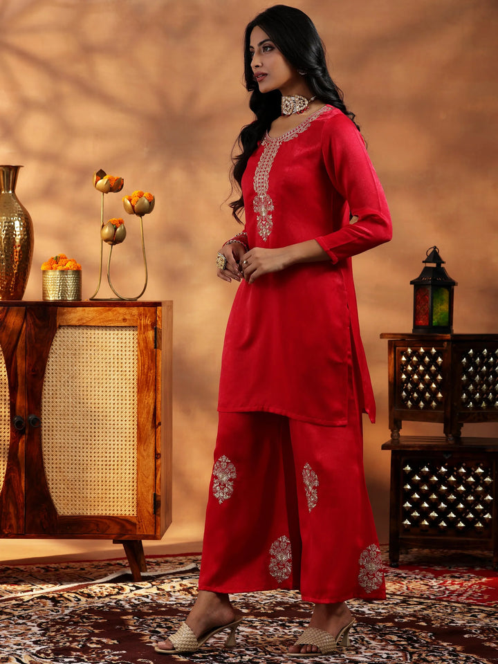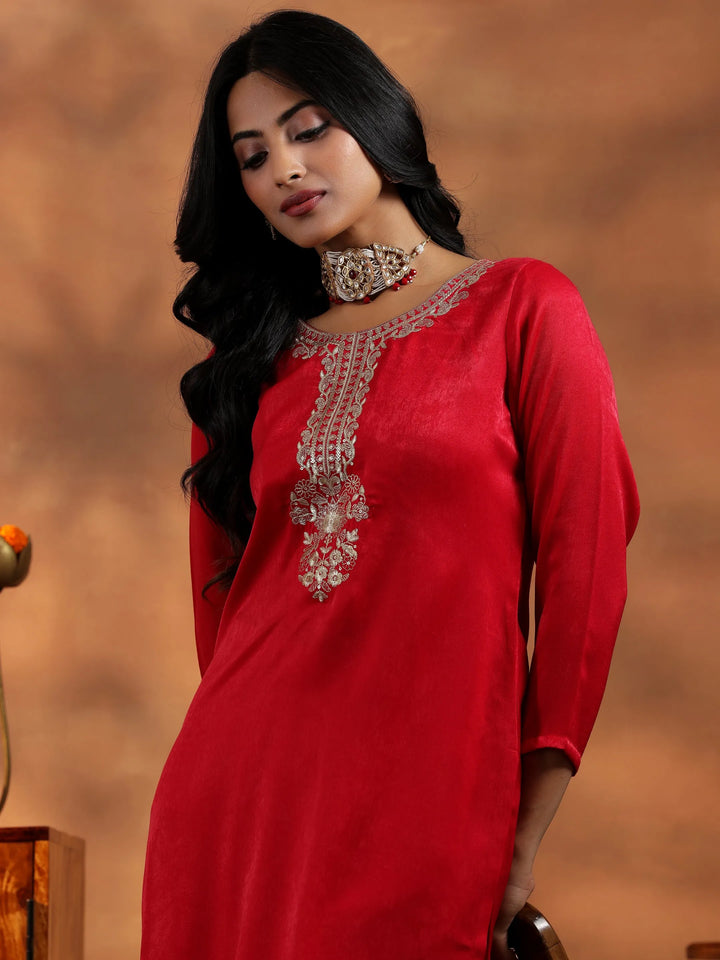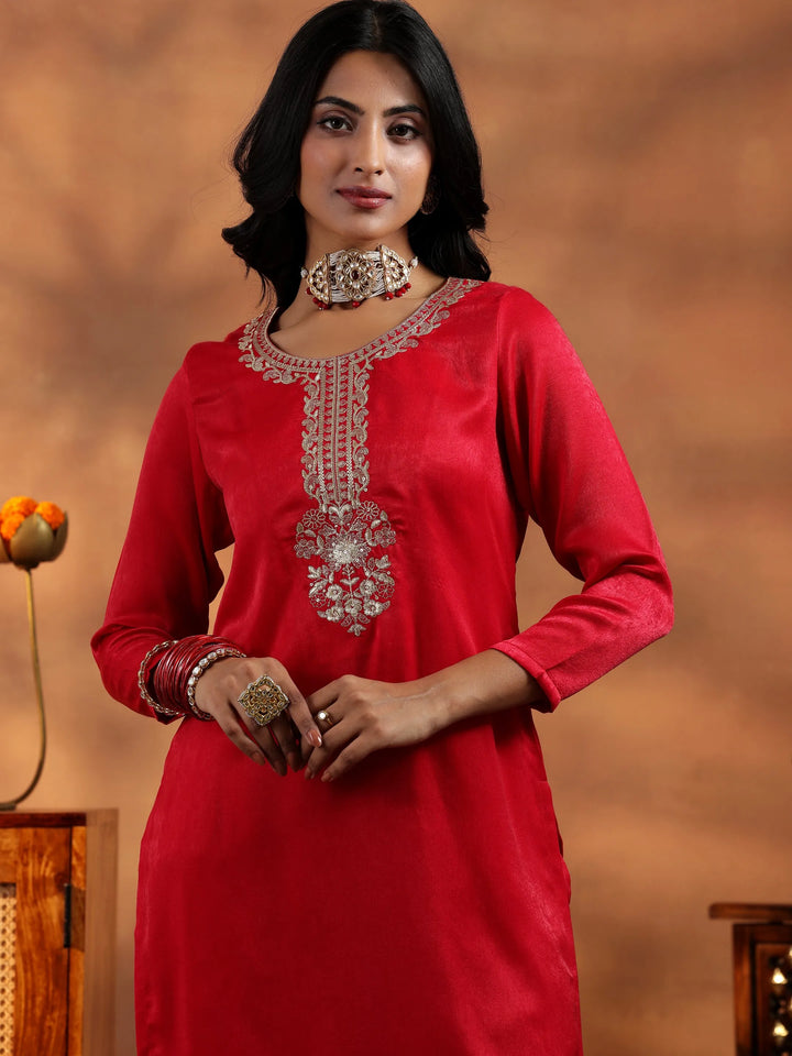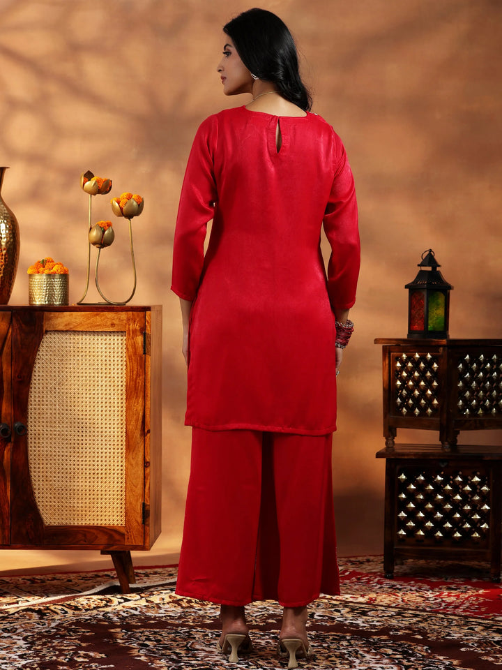Our 2-piece red embroidered Velvet co-ord set features a straight-fit tunic with a round neckline, three-quarter sleeves, and a statement yoke. Complemented with matching embroidered trousers with a partially elasticated waistband and roomy pockets. Adorned with intricate thread work and sequins, this style is perfect for light festivities.