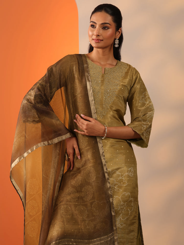 Our 3-piece olive silk blend kurta set features a straight-fit kurta with a mandarin collar, regular sleeves, and a statement yoke. Complemented with straight pants with a partially elasticated waistband and 2 pockets, and a printed dupatta. Adorned with embroidered bandhani prints, this style is perfect for semi festive occasions.