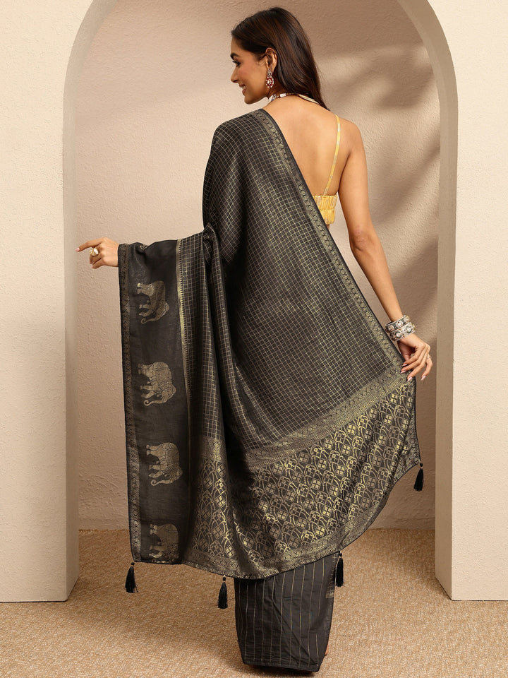 Black Checkered Woven Design Silk Blend Saree With Unstitched Blouse P