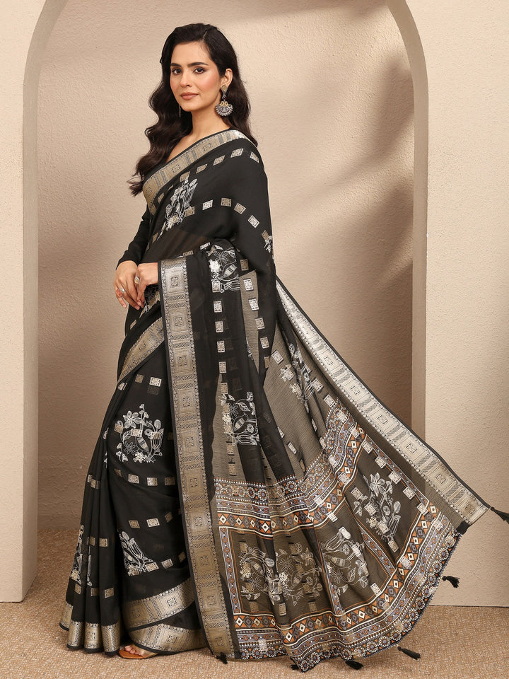 Black Printed Georgette Saree With Unstitched Blouse Piece