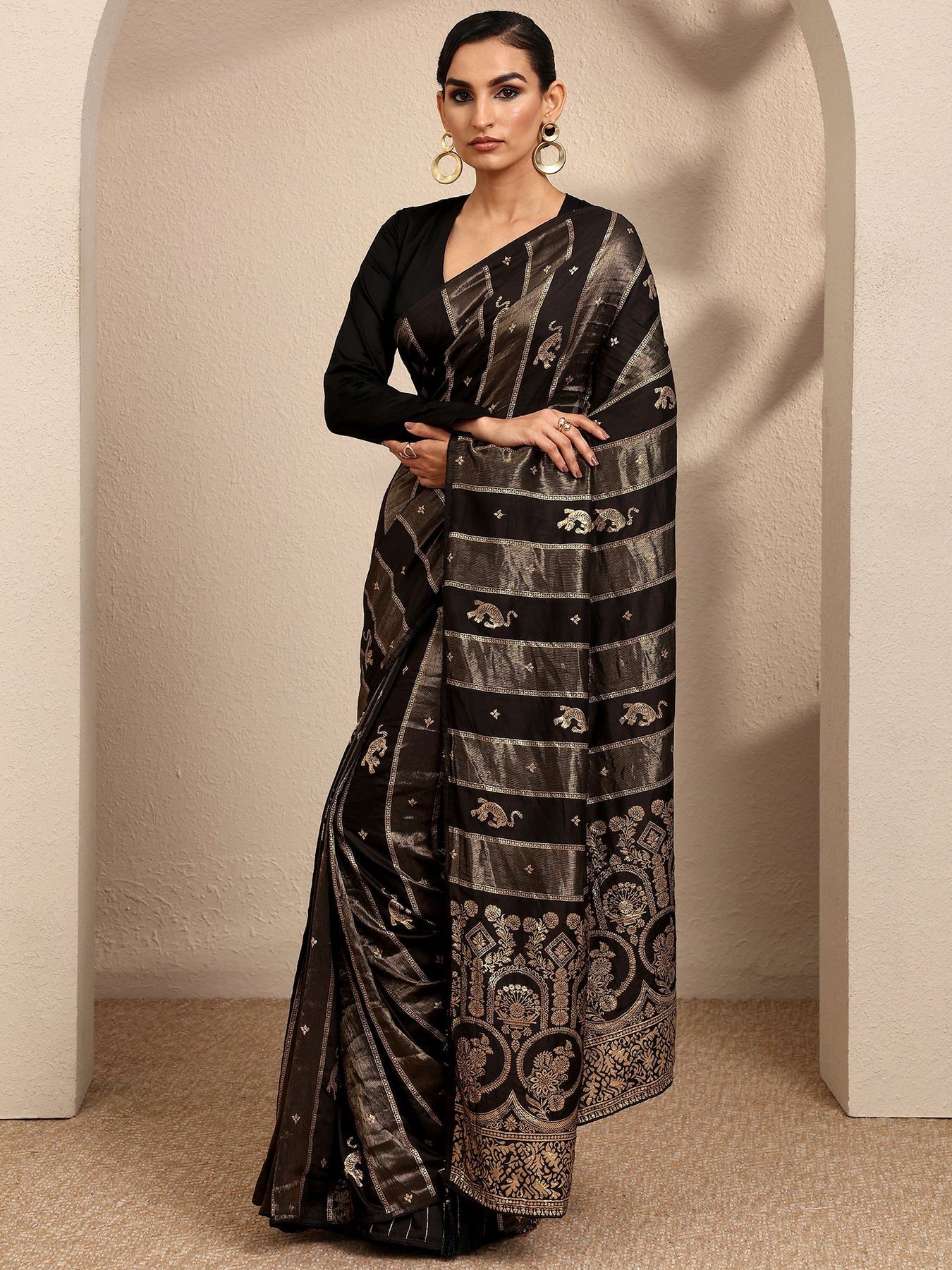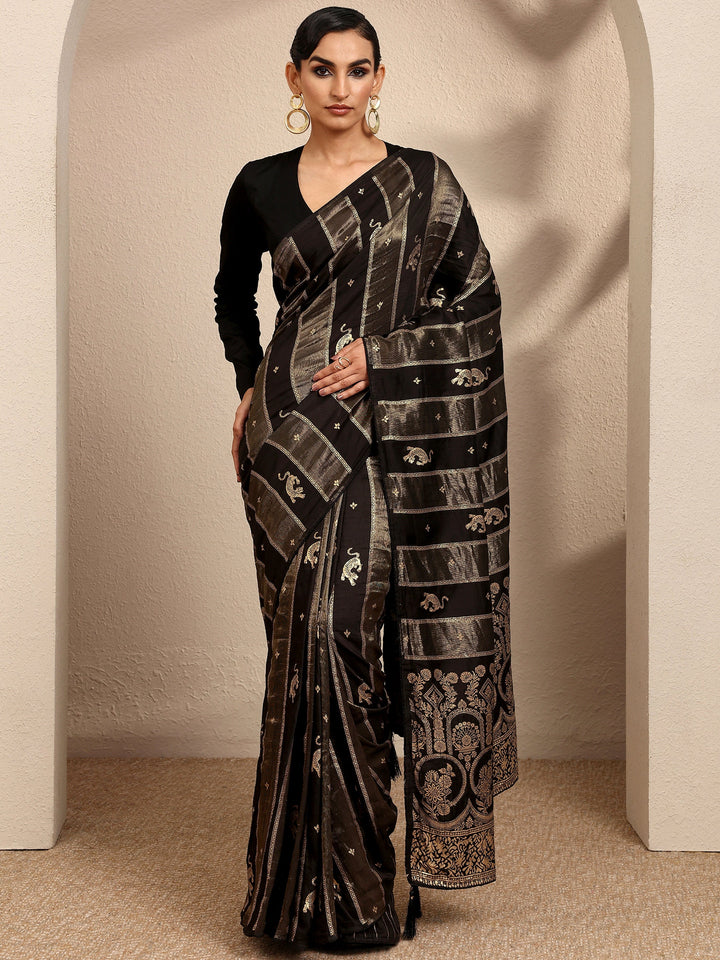 Black Woven Design Banarsi Silk Blend Saree With Unstitched Blouse Piece