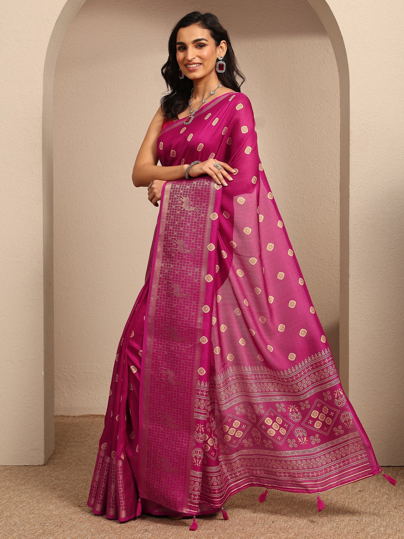 Our fuchsia printed silk blend saree features captivating Ethnic Motif pattern. Complemented with a blouse piece. This charming saree is perfect for festive occasions.