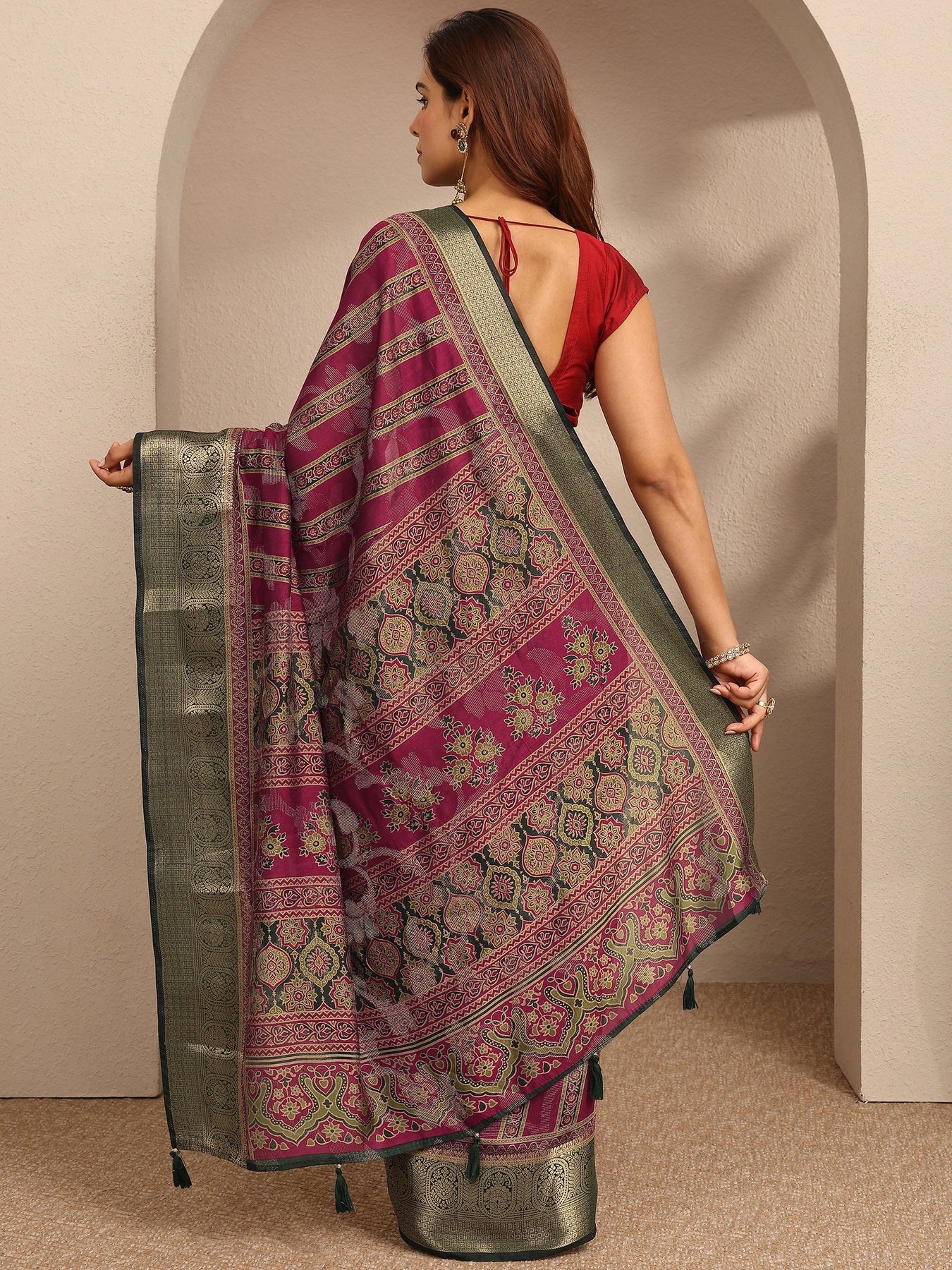 Pink Printed Silk Blend Saree With Unstitched Blouse Piece
