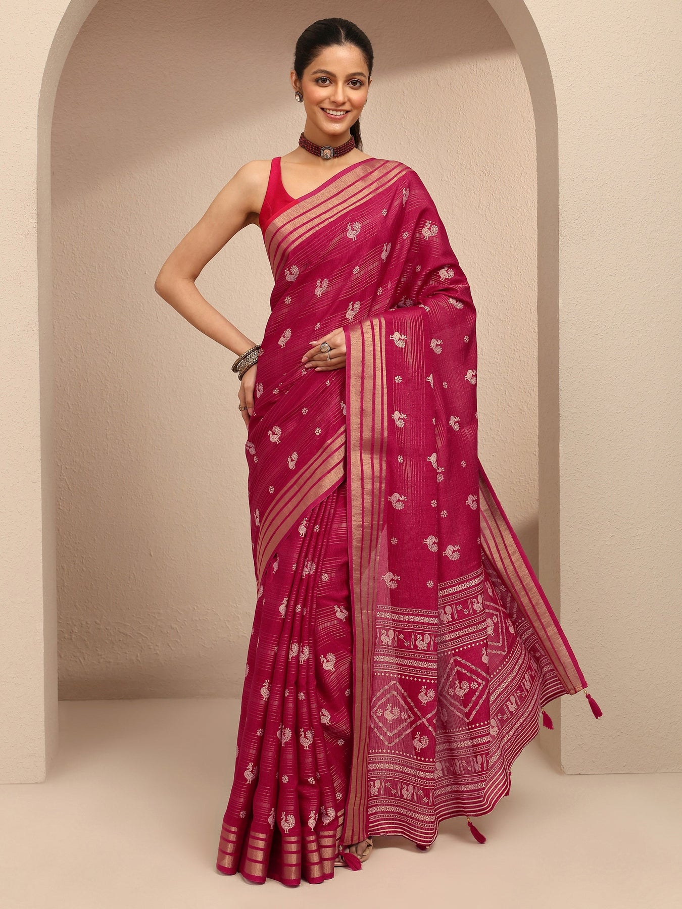 Our pink silk blend saree features captivating ethnic motif print. Complemented with an unstitched blouse piece. This charming saree is perfect for festive occasions.