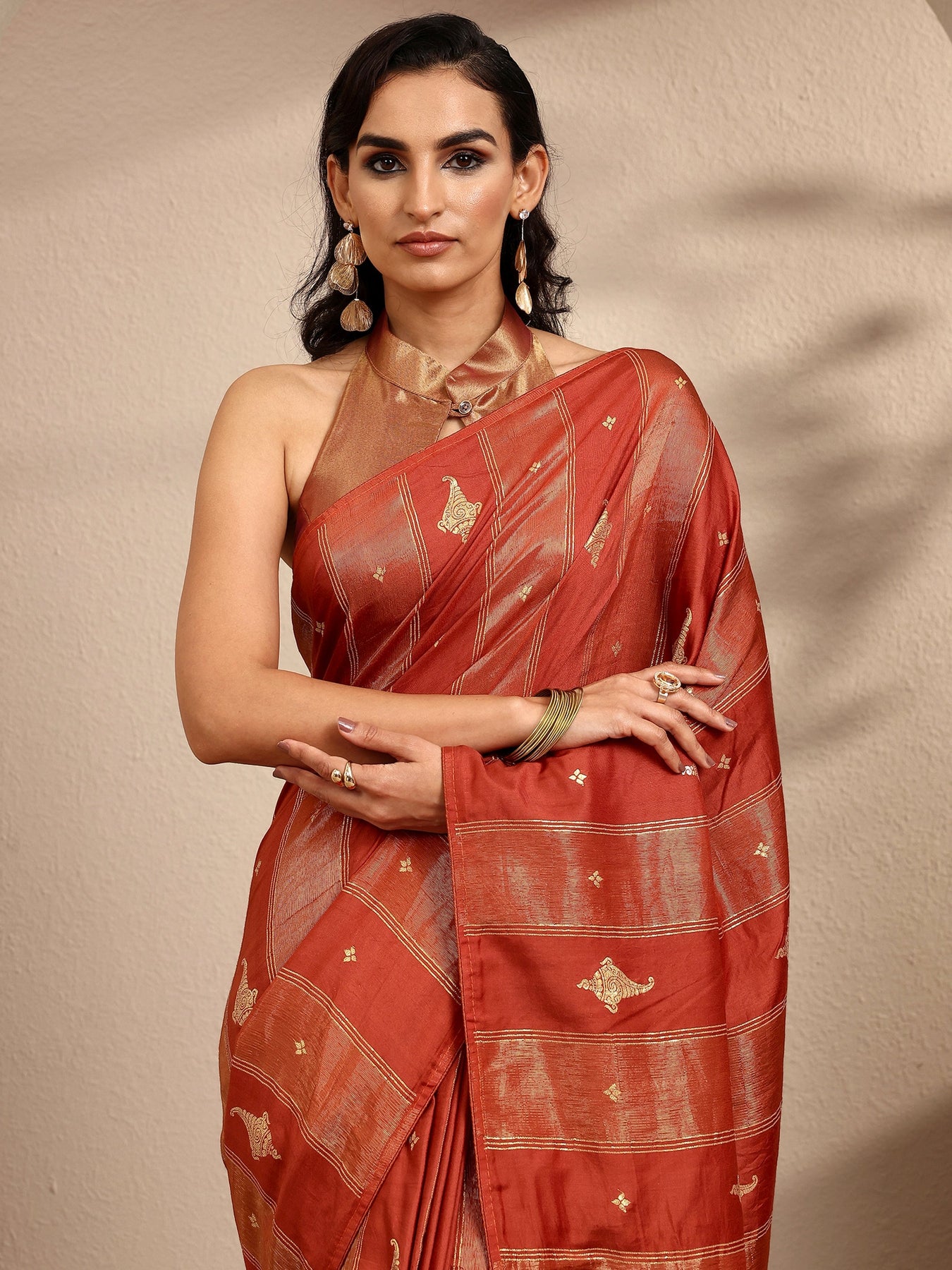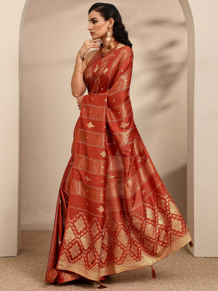 Rust Woven Design Banarsi Silk Blend Saree With Unstitched Blouse Piece