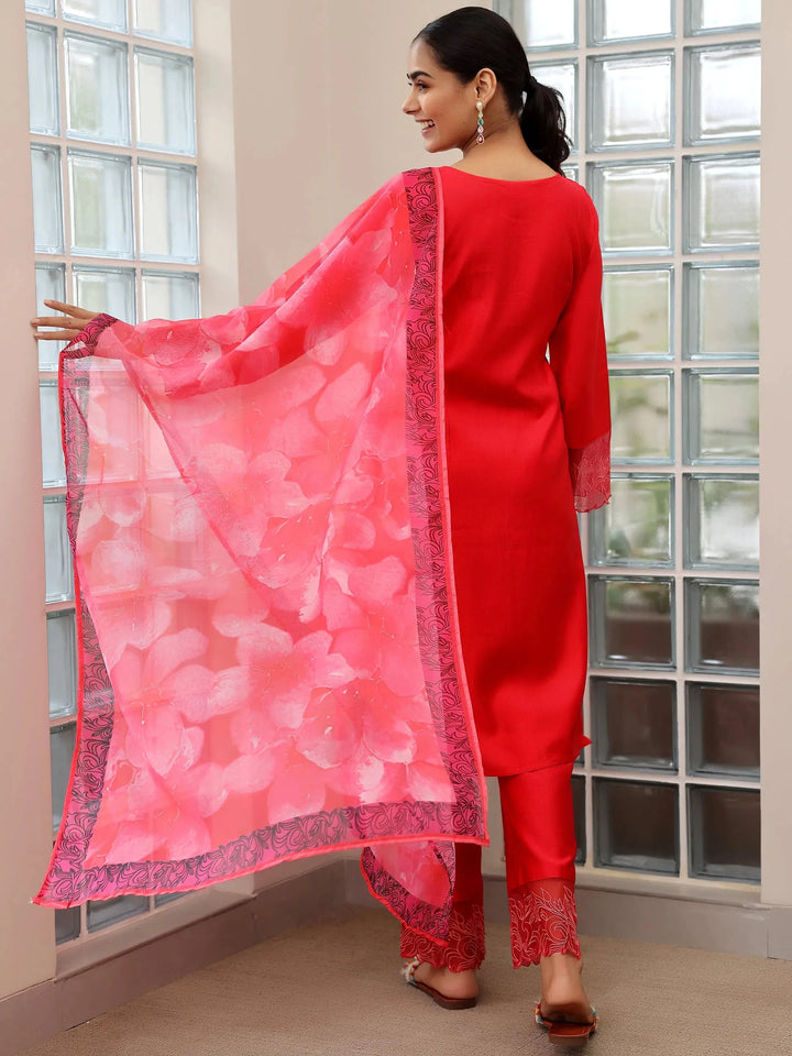 Red Yoke Design Silk Blend Straight Suit With Dupatta