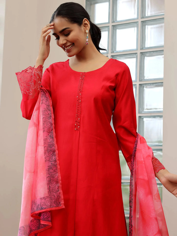 Our 3-piece red silk blend straight suit set features a round neckline kurta with comfortable full sleeves. Complemented with matching solid trousers with a partially elasticated waistband and roomy pockets, and a dupatta. Highlighted with beaded accents, stones, and intricate embroidery, this style is perfect for casual outings.