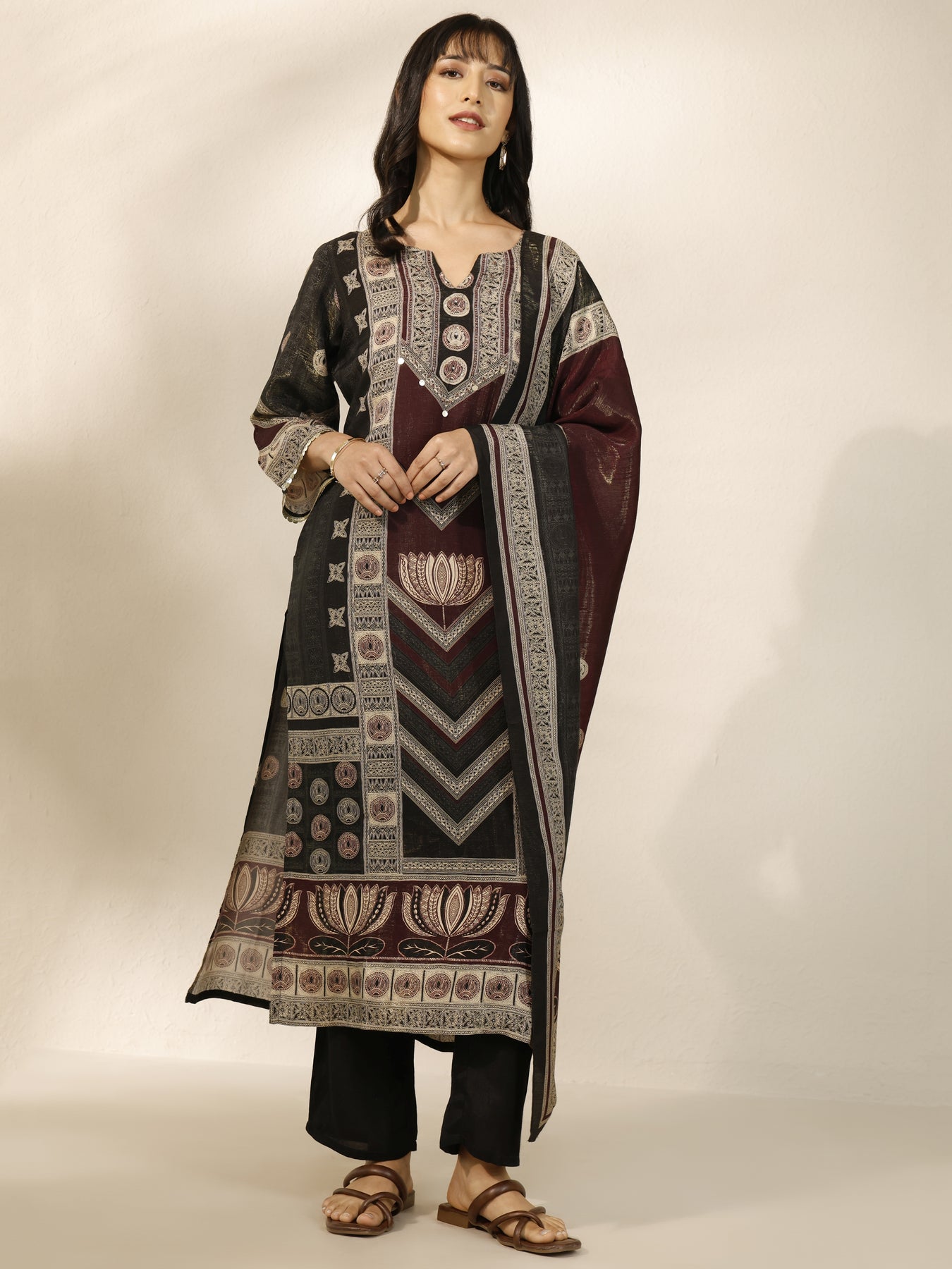 Black Printed Silk blend Straight Suit Set With Dupatta