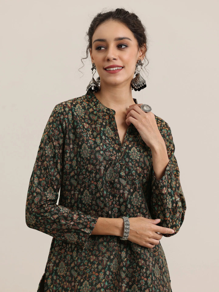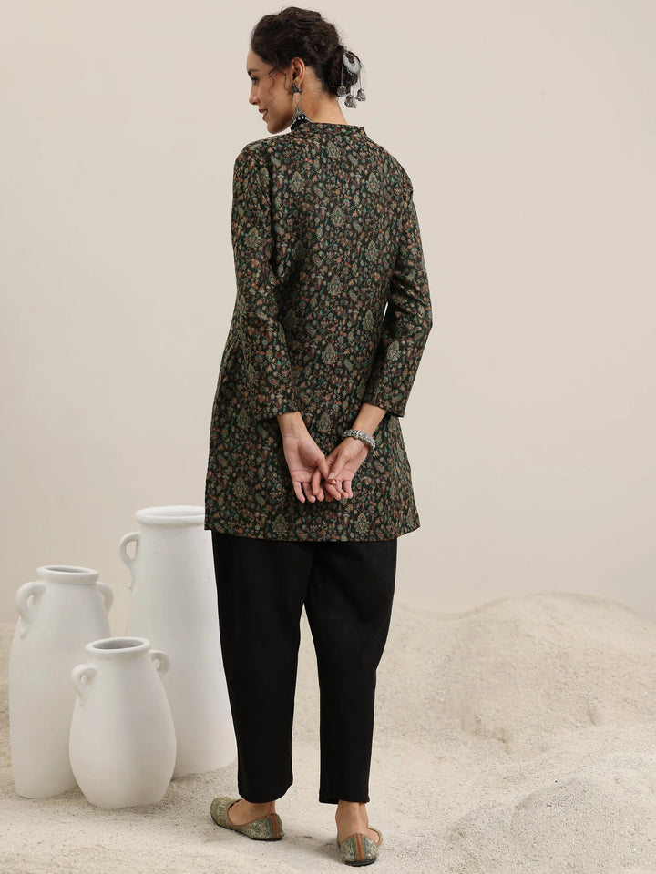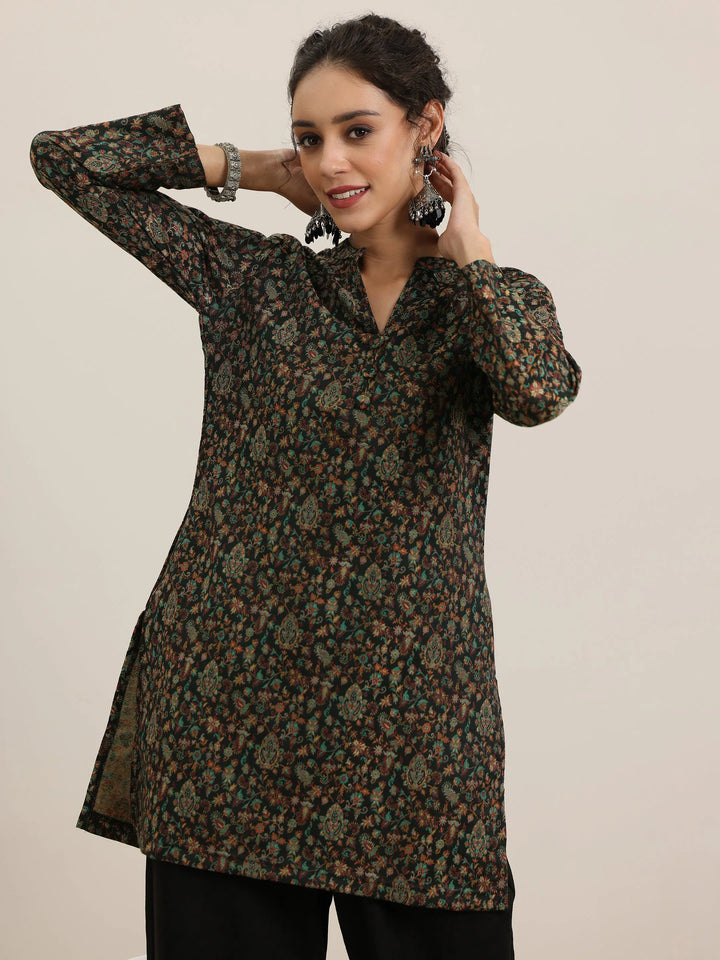Our 2-piece black woven design wool blend kurta set features a mandarin straight-fit front-slit kurta with a mandarin notched neckline and comfortable full sleeves. Complemented with palazzo pants with a partially elasticated waistband and roomy pockets. Elevated with floral prints and stylish button accents, this style is perfect for casual outings.