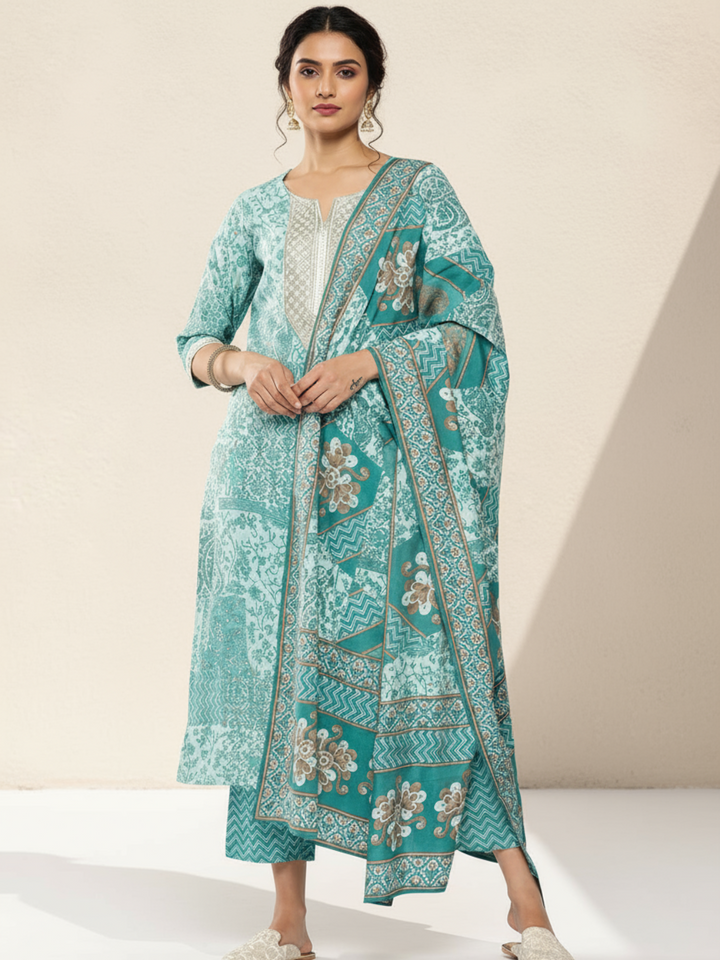 Our 3-piece blue printed silk blend suit set features a straight-fit floral print kurta with a notched neckline, three-quarter sleeves, and a statement yoke. Complemented with chevron print straight pants with a partially elasticated waistband and roomy pockets, and a dupatta in a matching print. Adorned with intricate embroidery delicate Gota Patti and sequins accents, this charming style is ideal for daytime festivities.