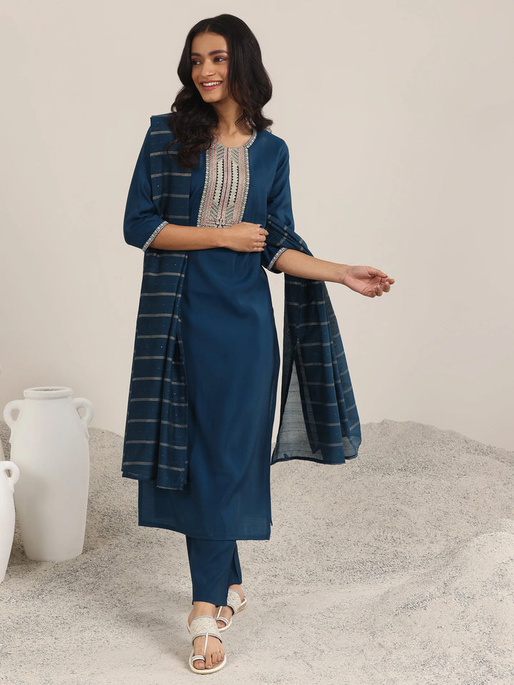 Our 3-piece blue yoke design silk blend straight suit set features a kurta with a round neckline, three-quarter sleeves, and a statement yoke. Complemented with trousers with a partially elasticated waistband and roomy pockets, and a dupatta. Highlighted with thread work and sequins, this style is perfect for casual outings.