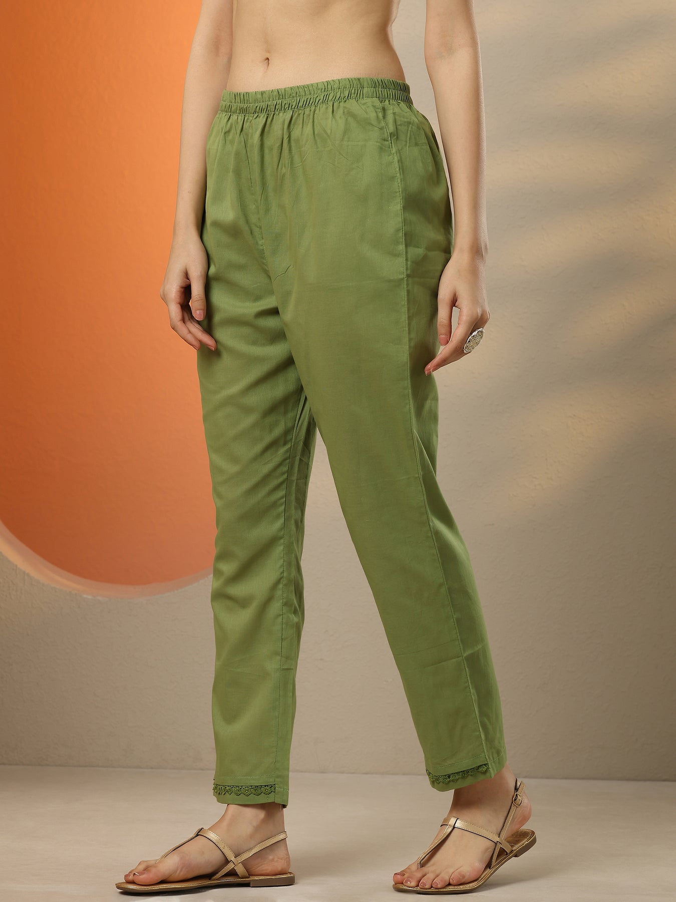 Our 3-piece green cotton straight-fit kurta set features a round neckline, regular sleeves, and statement yoke. Complemented with straight pants with a partially elasticated waistband and 2 pockets, and an embroidered dupatta. Adorned with Floral Embroidered, this style is perfect for festive occasions.