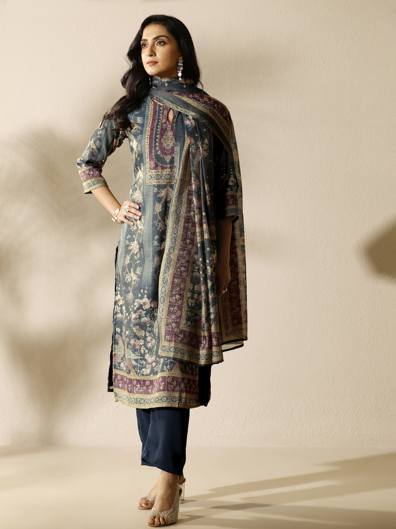 Our 3-piece Blue and Purple Silk blend Straight-fit Kurta Set features a Keyhole Neckline, Regular Sleeves, and statement Yoke. Complemented with Straight Pants with a Partially Elasticated waistband and 2 pockets, and a Heritage print dupatta. Adorned with floral printed, this style is perfect for Work Wear and Casual Wear.